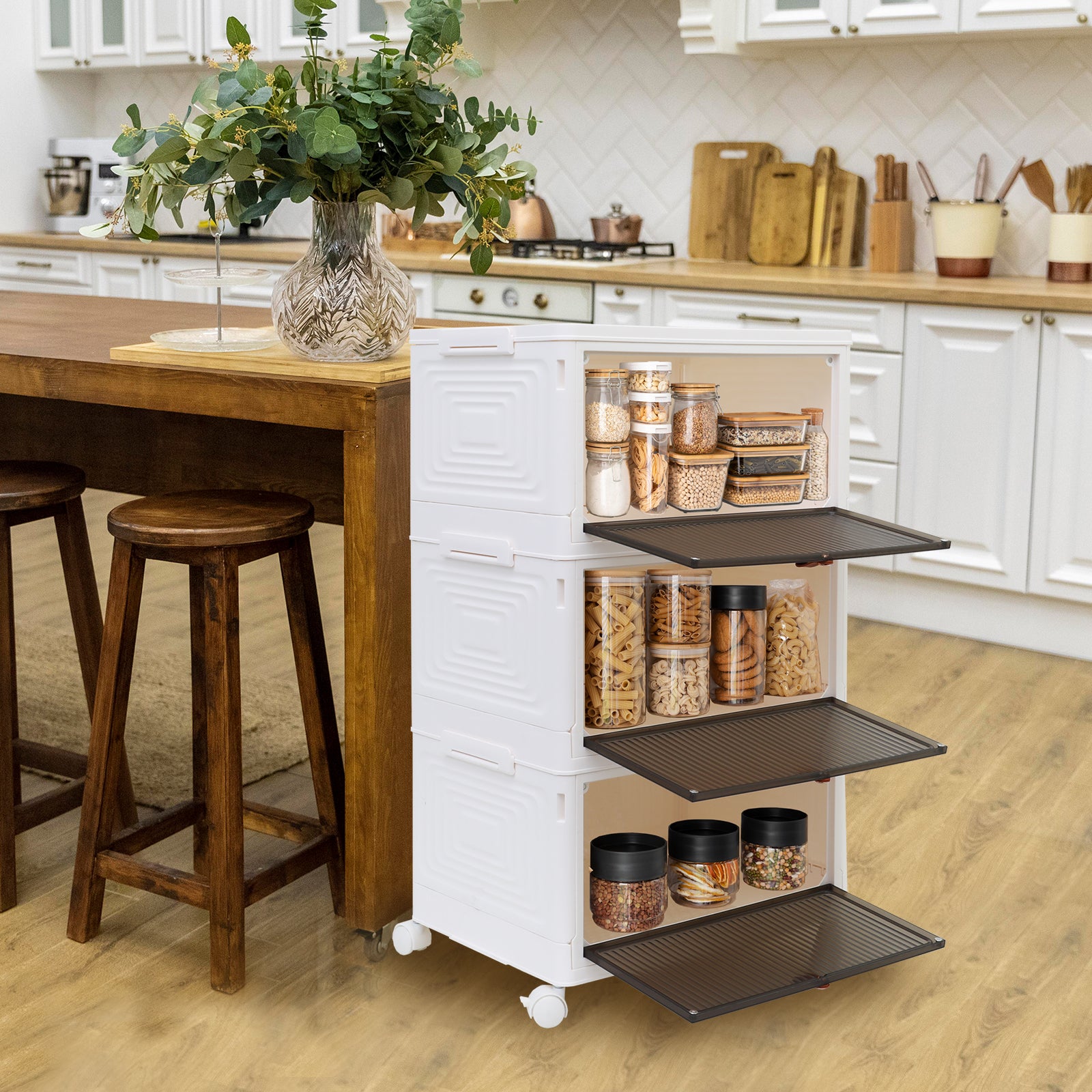This free standing storage container with lids and door is a must have for your house. It can be placed in bathroom, living room, kids room, kitchen, etc. perfect for snacks, wine, drinks, seasonings, utens, which can make it easy for you to organize like a pro. Simple storing things in a sufficient way just by open the lid, and take out things by opening the front door. Safety latch on the door ensures no falling of your items when moving the bin. It is easy to create the storage plan that works best for you in any room of your home