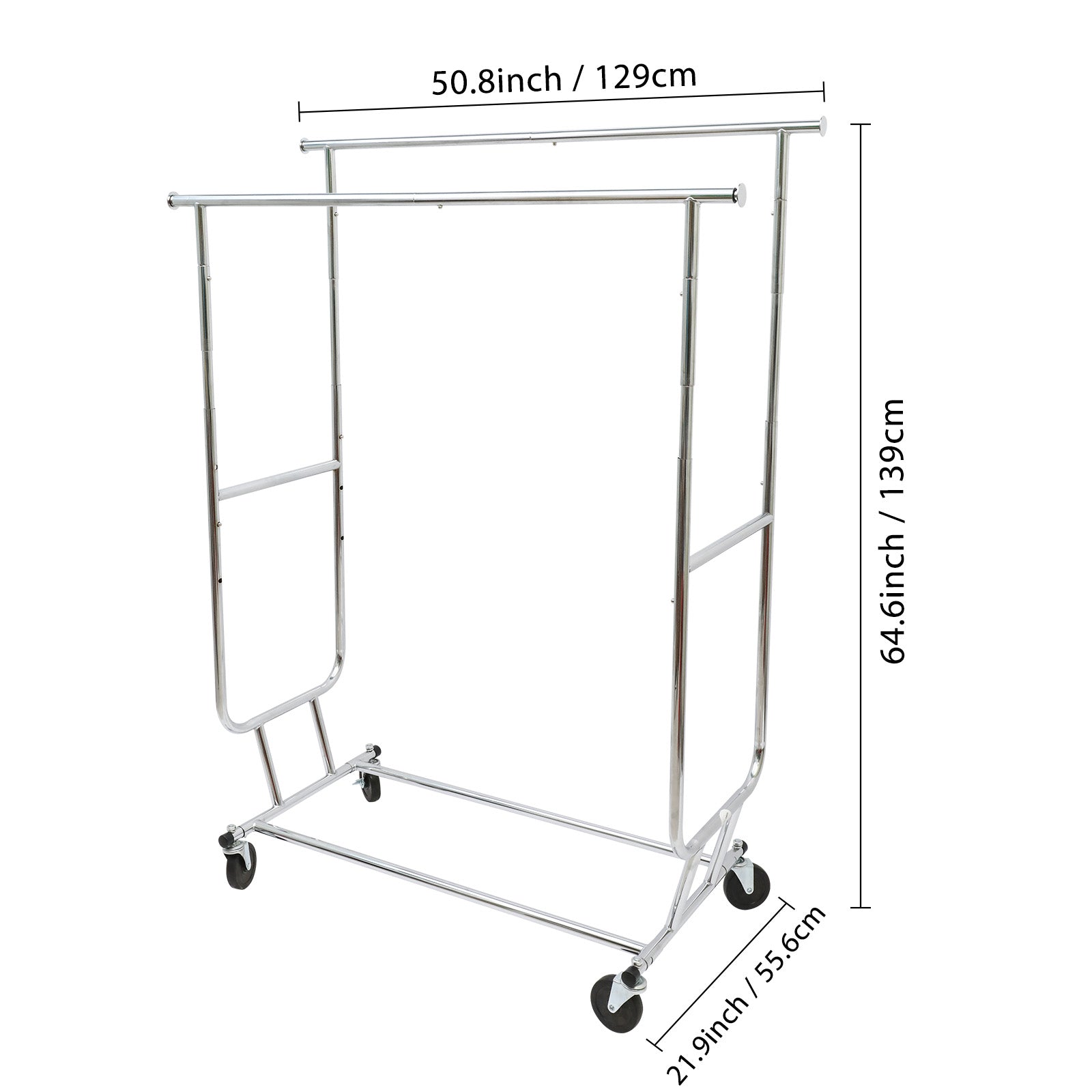 This versatile garment rack combines functionality and convenience, providing a tidy and organized storage experience. The double-bar design offers twice the capacity, making clothes drying and storage more convenient. The spacious bottom shelf easily stores shoes, accessories, and other items, keeping everything in its place. The rack features an adjustable design with extendable rods and height, allowing you to customize your storage space. Made with thick 1-inch steel diameter, it ensures strength and stability, keeping your clothes secure. Equipped with four universal wheels (two lockable), the rack moves effortlessly, whether in the bedroom or laundry room. The wheeled design allows for easy garment retrieval, making daily clothing selection a breeze. Choose this garment rack to simplify and enhance your storage efficiency.