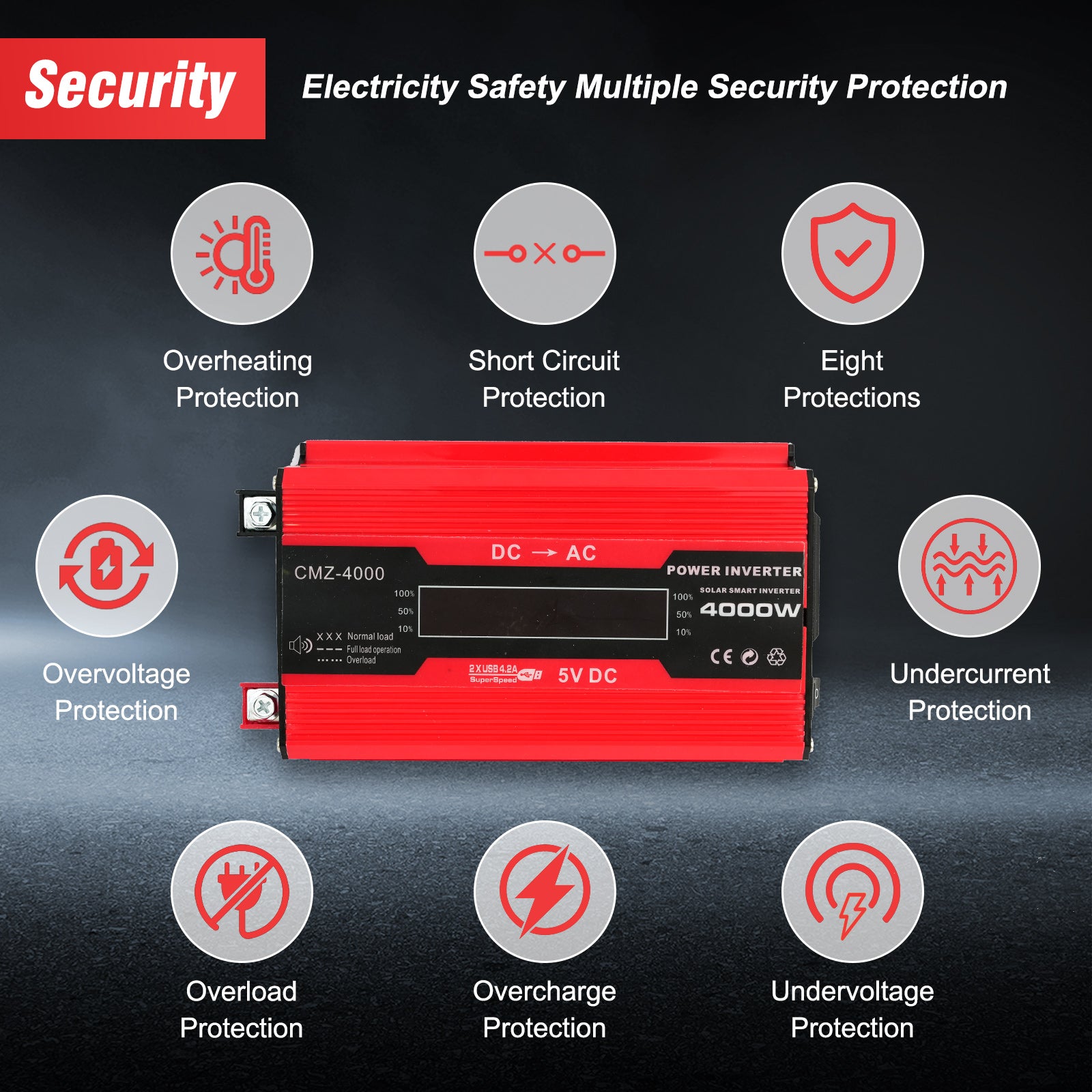 4000W Power Inverter, Pure Sine Wave Inverter DC 12V to AC 120V Car Inverter for RV Truck Car Solar System Travel Camping, 4.2A Fast Charging