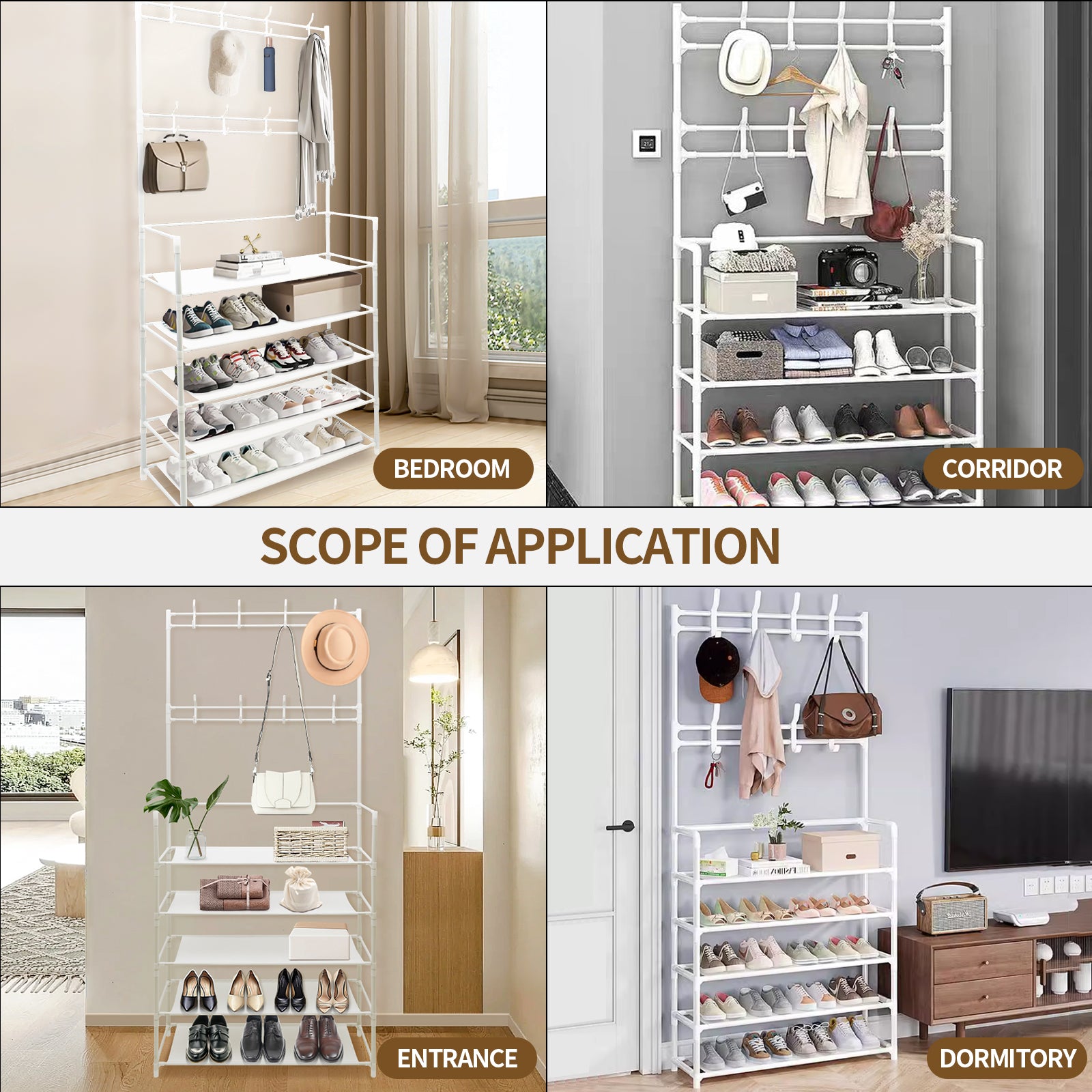 Our white 5-layer floor-standing shoe and hat rack adopts a simple design concept to perfectly integrate beauty and practicality. The coat rack has five layers of shelves and 8 detachable hooks to give you more storage space. Its elegant white exterior not only adds a touch of freshness to your home environment, but also shows your unique taste. Whether it's in the hallway, bedroom or cloakroom, it can be a beautiful sight. Choose it to make your home life more organized and tidy.