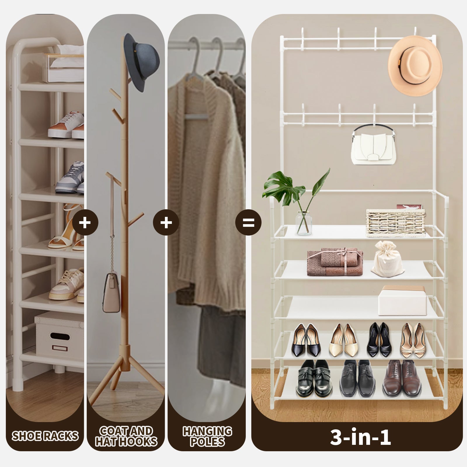 5-Tier Coat and Shoe rack with 8 Hooks, White