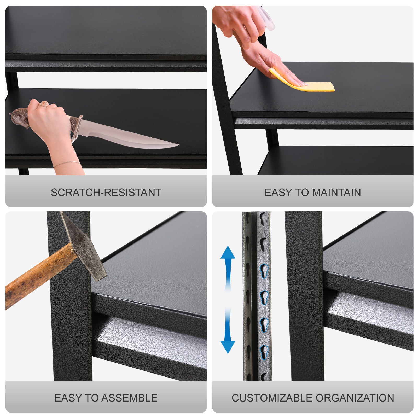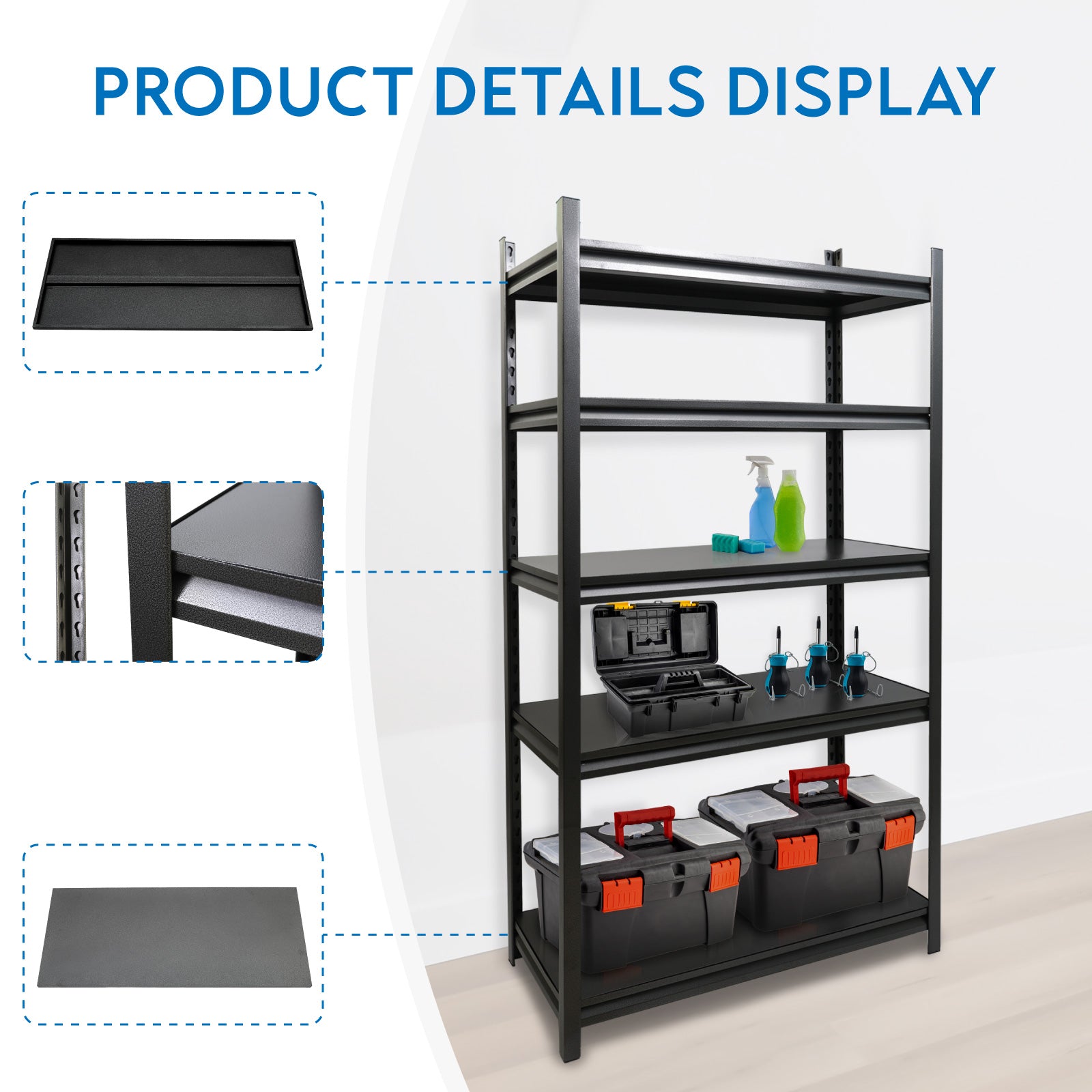 Our proud 5-tier black heavy-duty metal storage shelves are known for their superior sturdiness and excellent weight capacity. Each layer is designed and reinforced to easily carry heavy items, ensuring that your belongings are stored safely and organised. Unlike traditional wooden shelves, this heavy-duty storage solution boasts a moisture-resistant and water-repellent coating, ensuring easy cleaning and low-maintenance maintenance. Choose sturdy, customizable, easy to maintain, versatile, and durable shelves to keep your belongings organized and life more convenient!