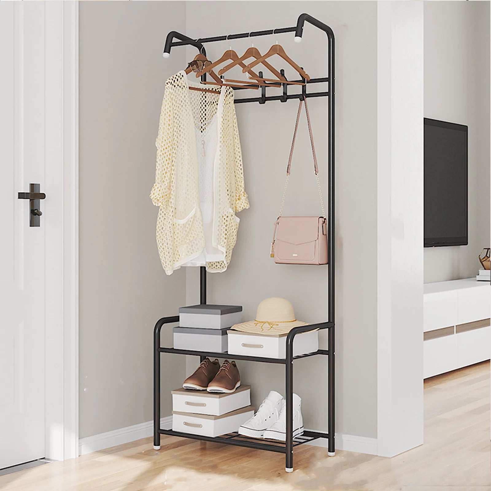 This practical and fashionable coat rack is a great multi purpose combination of coat hanger, shoe rack and hanging rail, helping you well organize your clothes, shoes, umbrellas, hats and bags in your entryway, bedroom, office, etc.. 3 in 1, saving space. It is made of high-quality material, which is strong in bearing capacity, stable and durable. This item is also easy to use and simple to install.