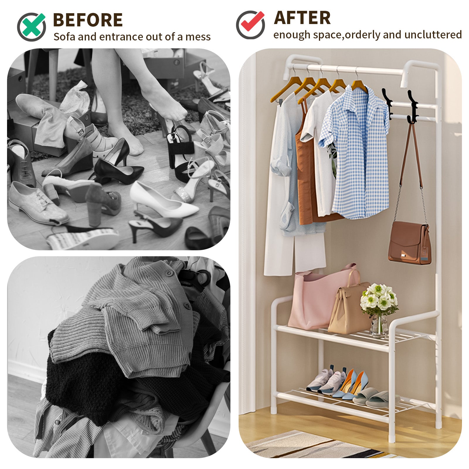 This baokaler 3 in 1 white coat rack floor shelf, is a great multi-purpose combination of hangers, shoe racks and storage racks to help you organize your clothes, shoes, umbrellas, hats and bags in the hallway, bedroom, office and more, saving you space. Moreover, the shelves are made of high-quality materials, with strong bearing capacity, stability and durability, bringing unprecedented convenience to your home life. Choose this free-standing metal coat rack with entryway bench to make your home life even better!