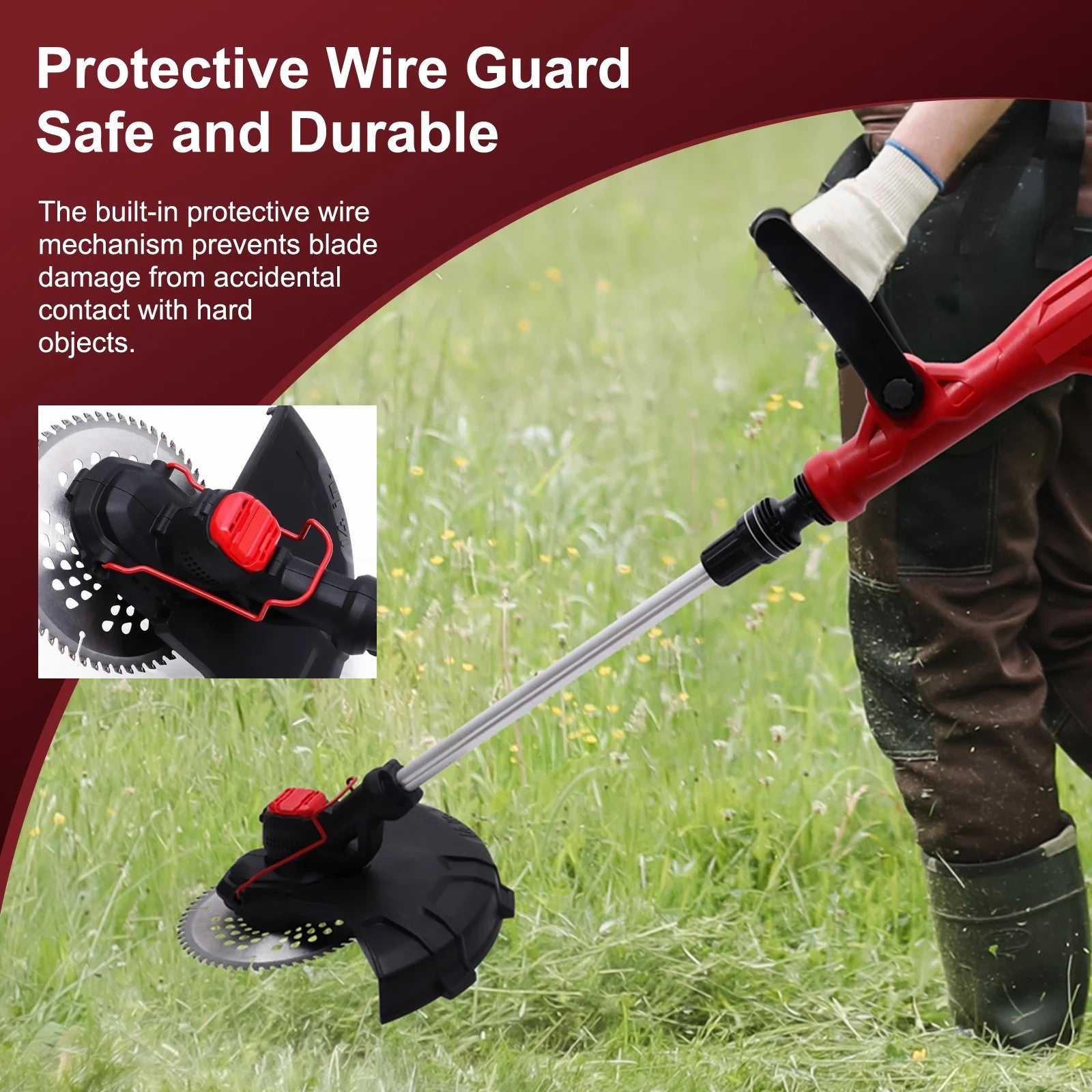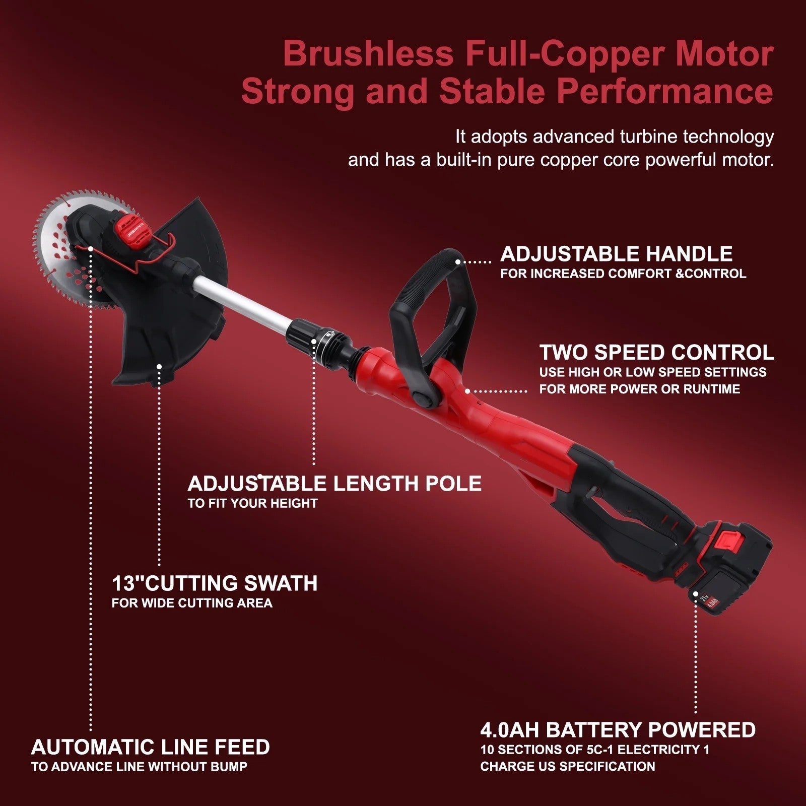 This lawn mower integrates multiple innovative designs, featuring a freely adjustable length of 110-130CM to accommodate the heights of the entire family, allowing for more effortless, upright work. The dual-handle control ensures balance and stability,