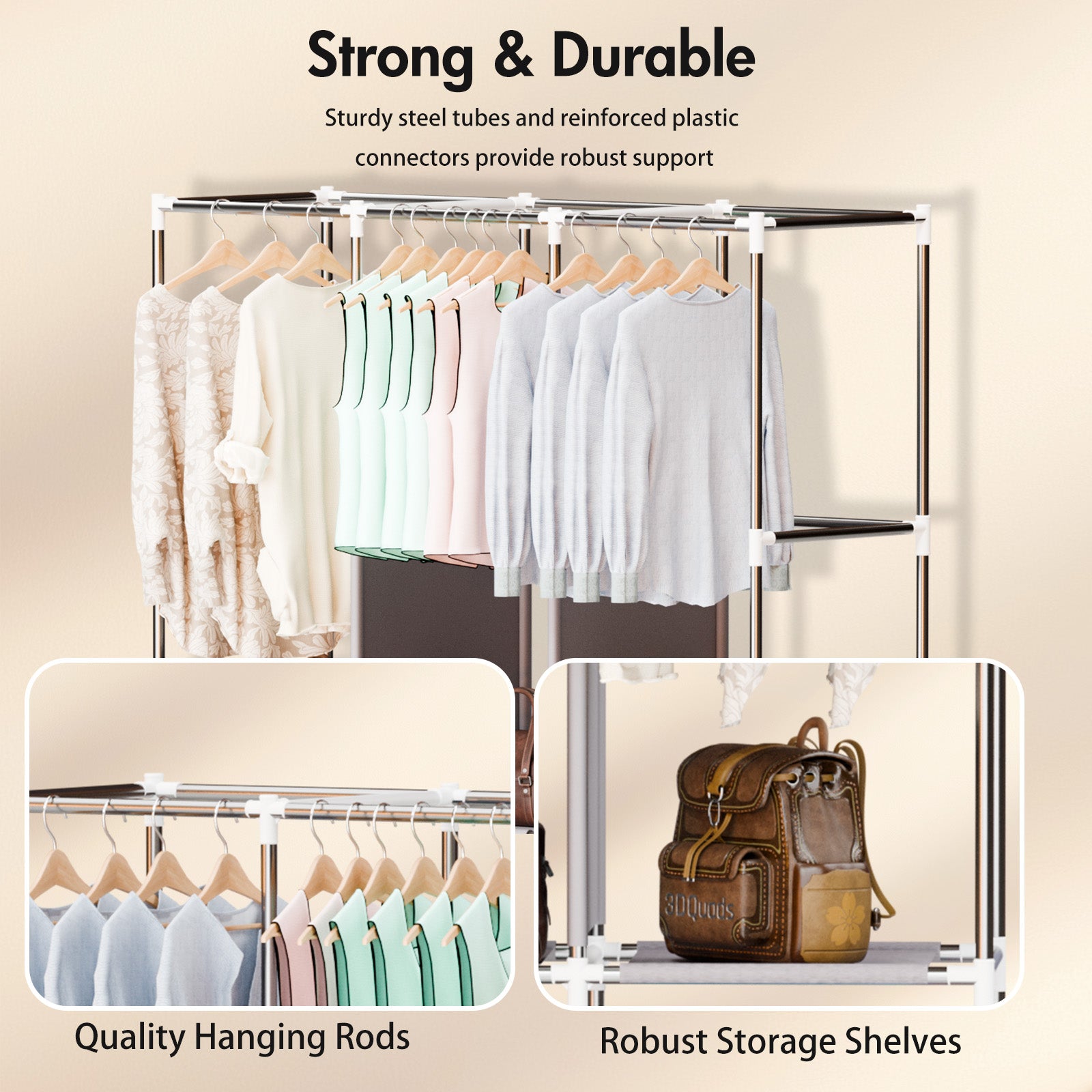 This clothes organizer is the ideal storage solution for small spaces. Constructed with sturdy iron pipes and reinforced PP connectors, it ensures stable weight support and gently cares for each garment. The spacious and organized interior, with multiple rods and shelves, meets various storage needs, keeping clothing and accessories tidy.