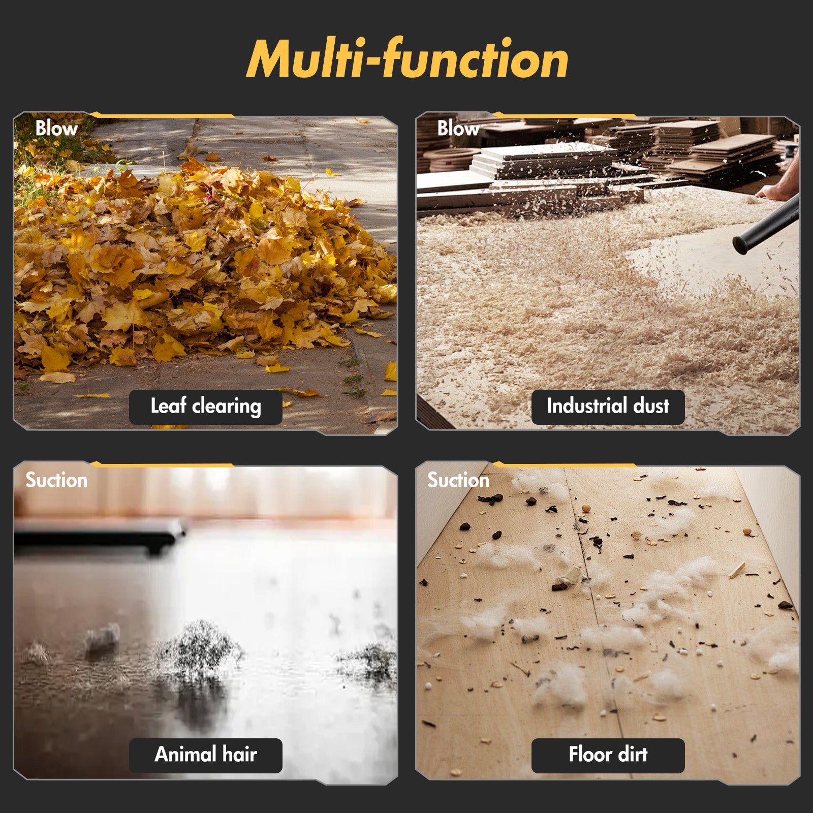 This leaf blower features a built-in high-efficiency 15000RPM motor, delivering powerful performance that easily sweeps away leaves and dust. It is a versatile tool, not only for leaf blowing but also for household cleaning, car blowing, and outdoor inflating, catering to various needs. With multiple speed settings, the blower can reach wind speeds of up to 29m/s, allowing for gentle dusting or powerful sweeping, all at your convenience. The innovative curved multi-hole cooling technology effectively reduces heat, prolonging the life of the motor and preventing overheating. With outstanding performance and flexibility, this blower becomes a valuable assistant in your daily life.