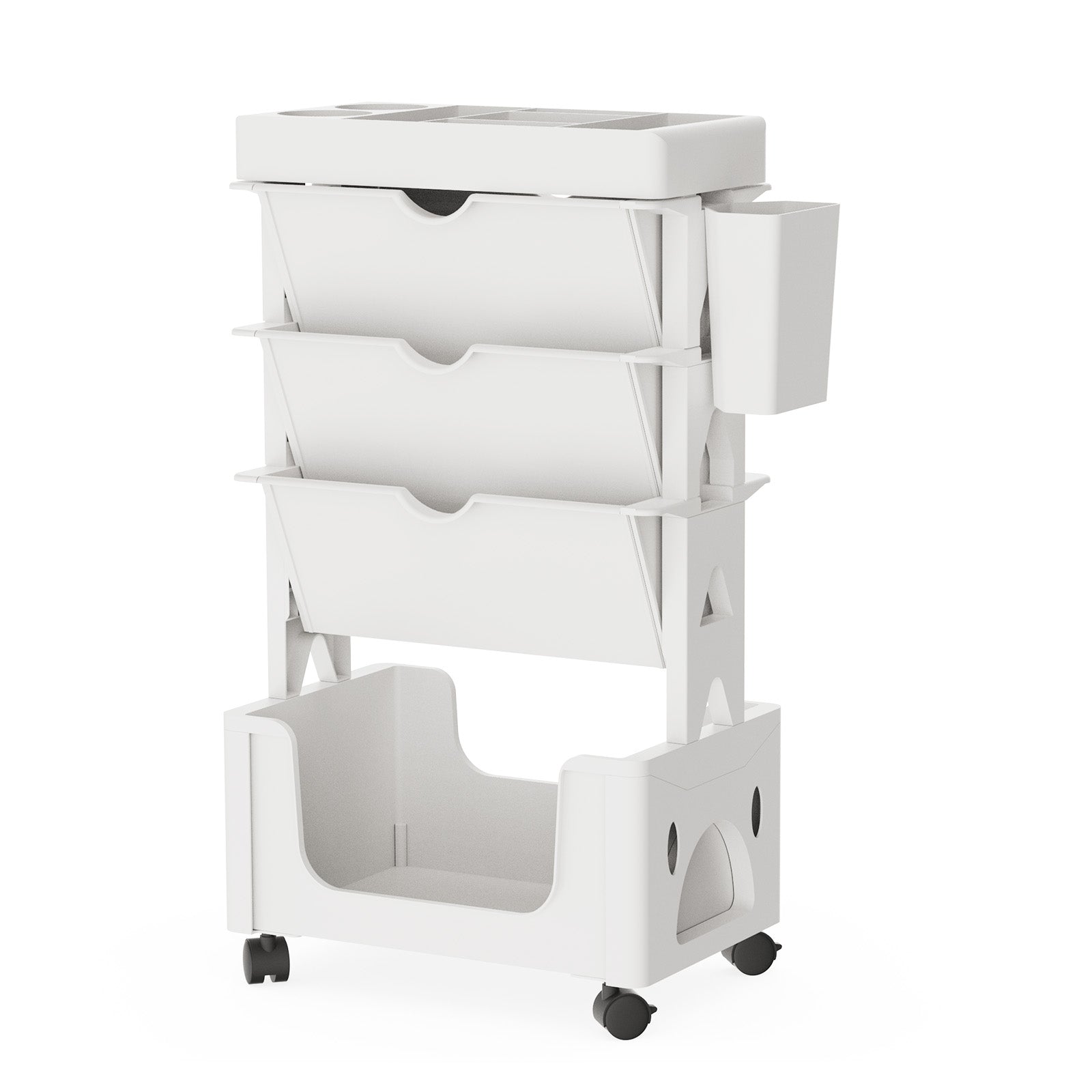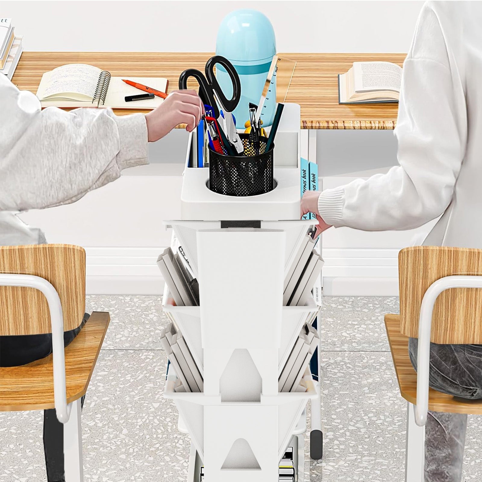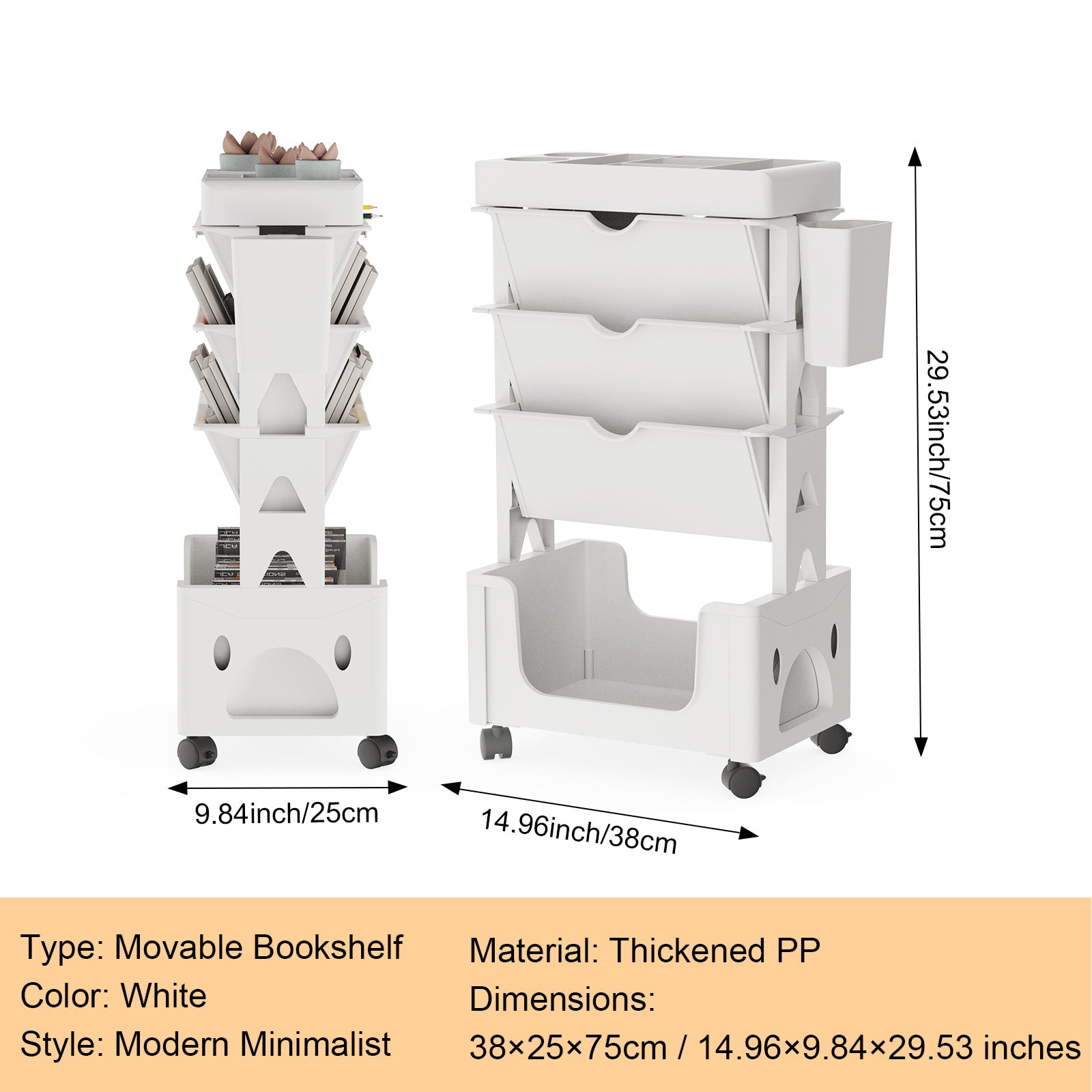 CATGOOD Movable Book Rack with Pen Holder, 5-Tier Storage Bookcase Organizer Mobile Bookshelf Cart with Wheels, Mobile Utility Cart Storage, for Living Room Classroom Office, White