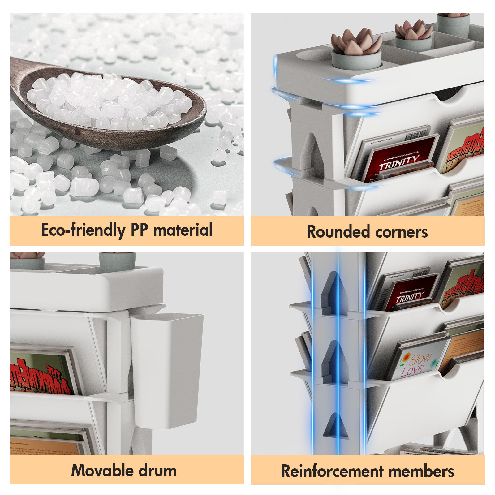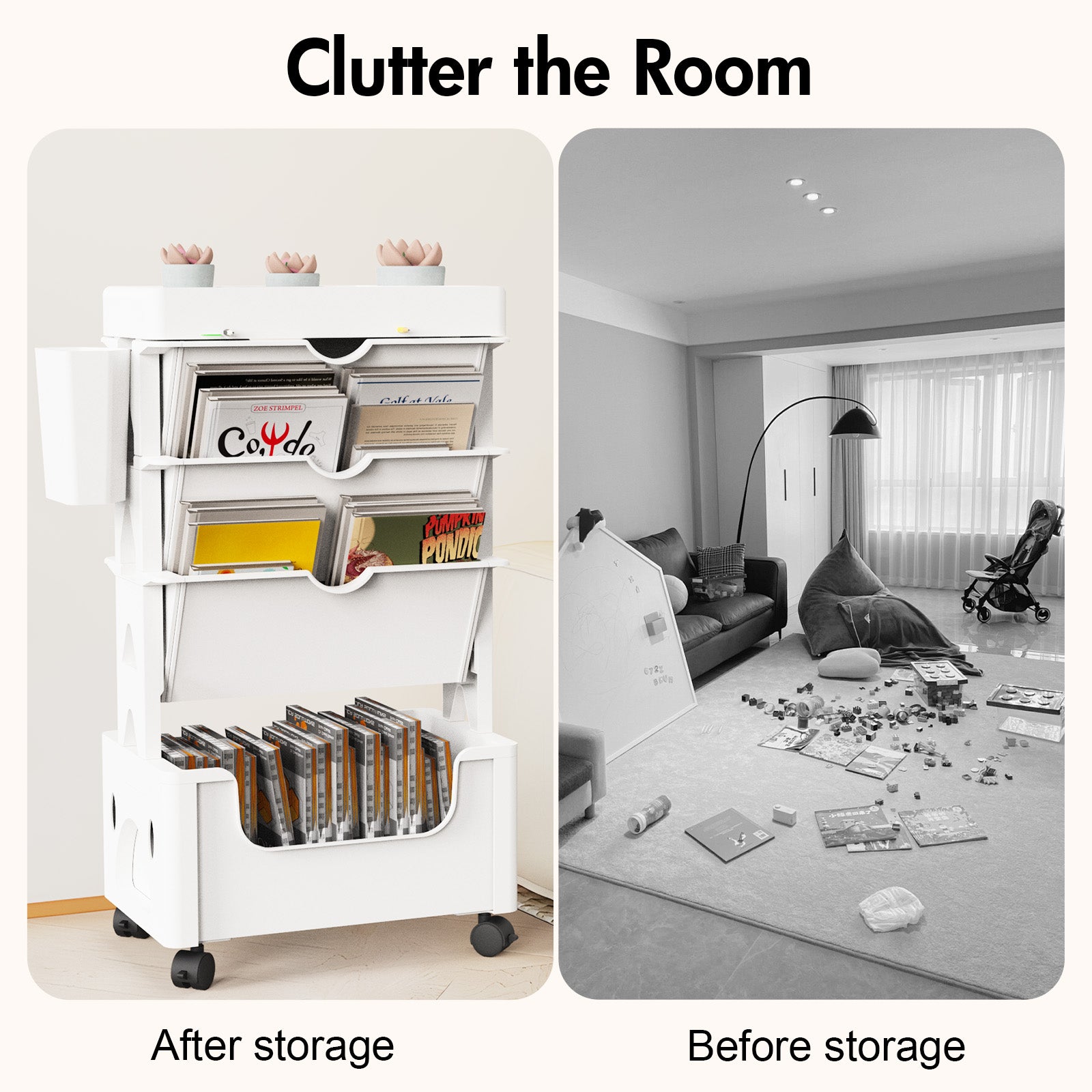 The rolling bookshelf car can provide you 5 surprising large capacity shelves, easy to stackable, take and storage, Multi-layer storage, classified storage of books, documents. say goodbye to chaos, make your life more orderly and more organized. High-quality plastic coupled with a stable four-wheel bottom design gives you convenience and security. If you want to go from the study to the bedroom to study or work, you only need books, pens, cups and other items on the top, a desk cart will becomes a portable storage box can be easily transferred, without forth several times.