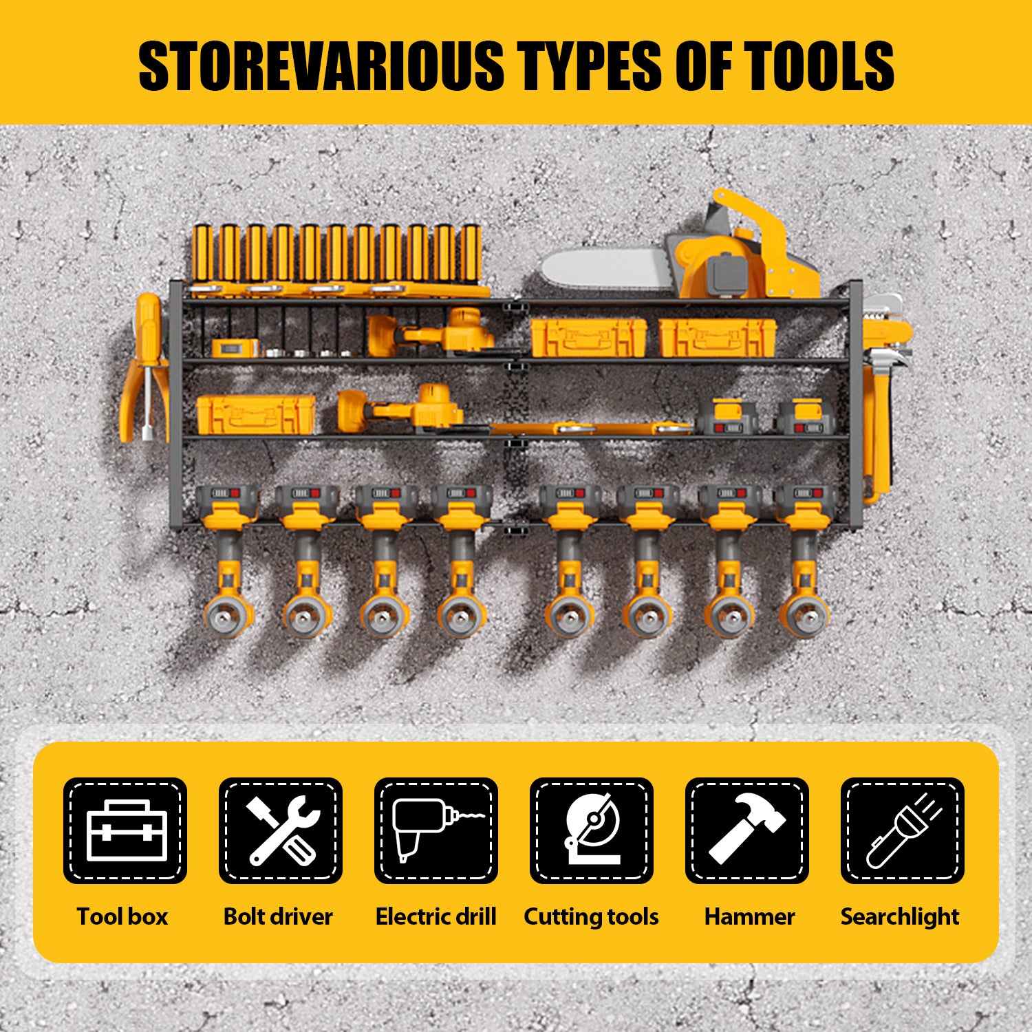 The power tool organizer wall mount features a heavy-duty design to withstand the weight of your tools and equipment, ensuring long-lasting durability. It may help you arrange all of your frequently used tools so that they are all available and can transform your unkempt workbench or unused wall space into a tidy and effective workspace. Choose ALSO GO storage racks for a comfortable and clean space!
