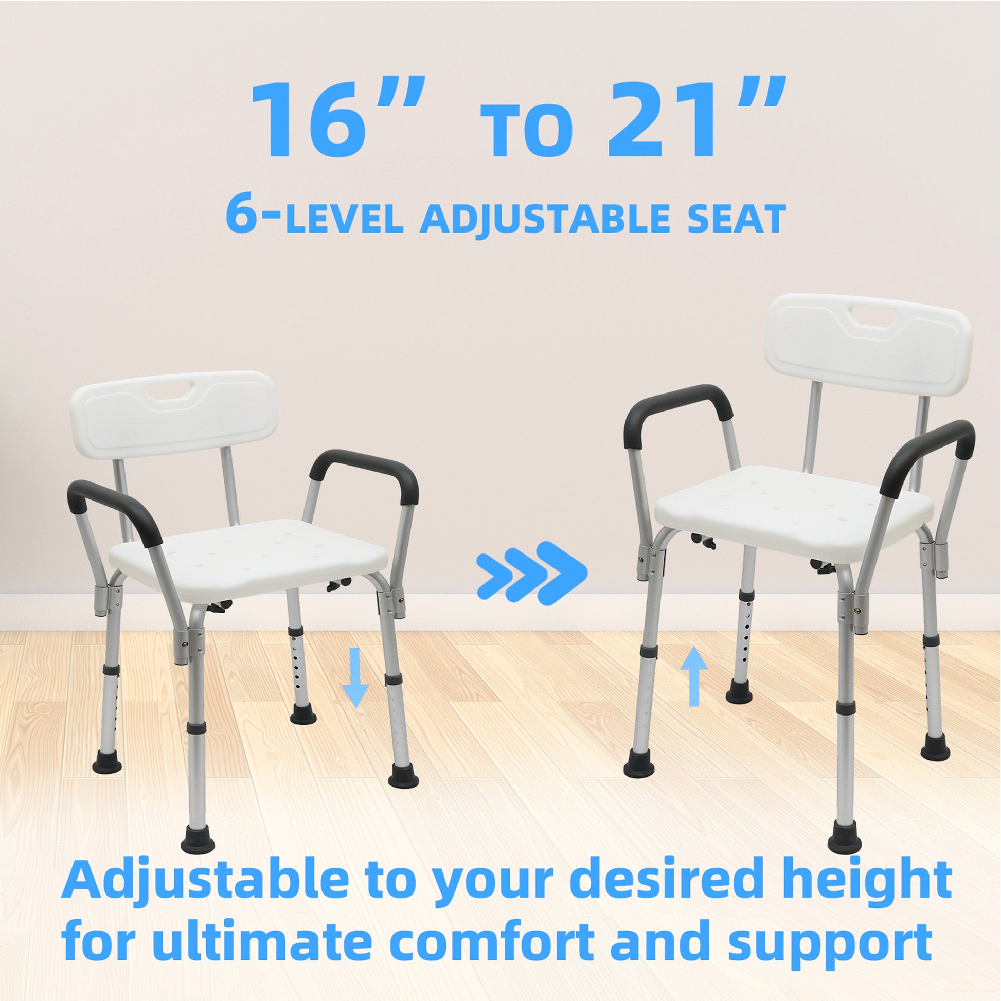 With a lightweight design, this shower chair is adjustable in seat height between 16" and 21" to meet the varying needs of different people.
