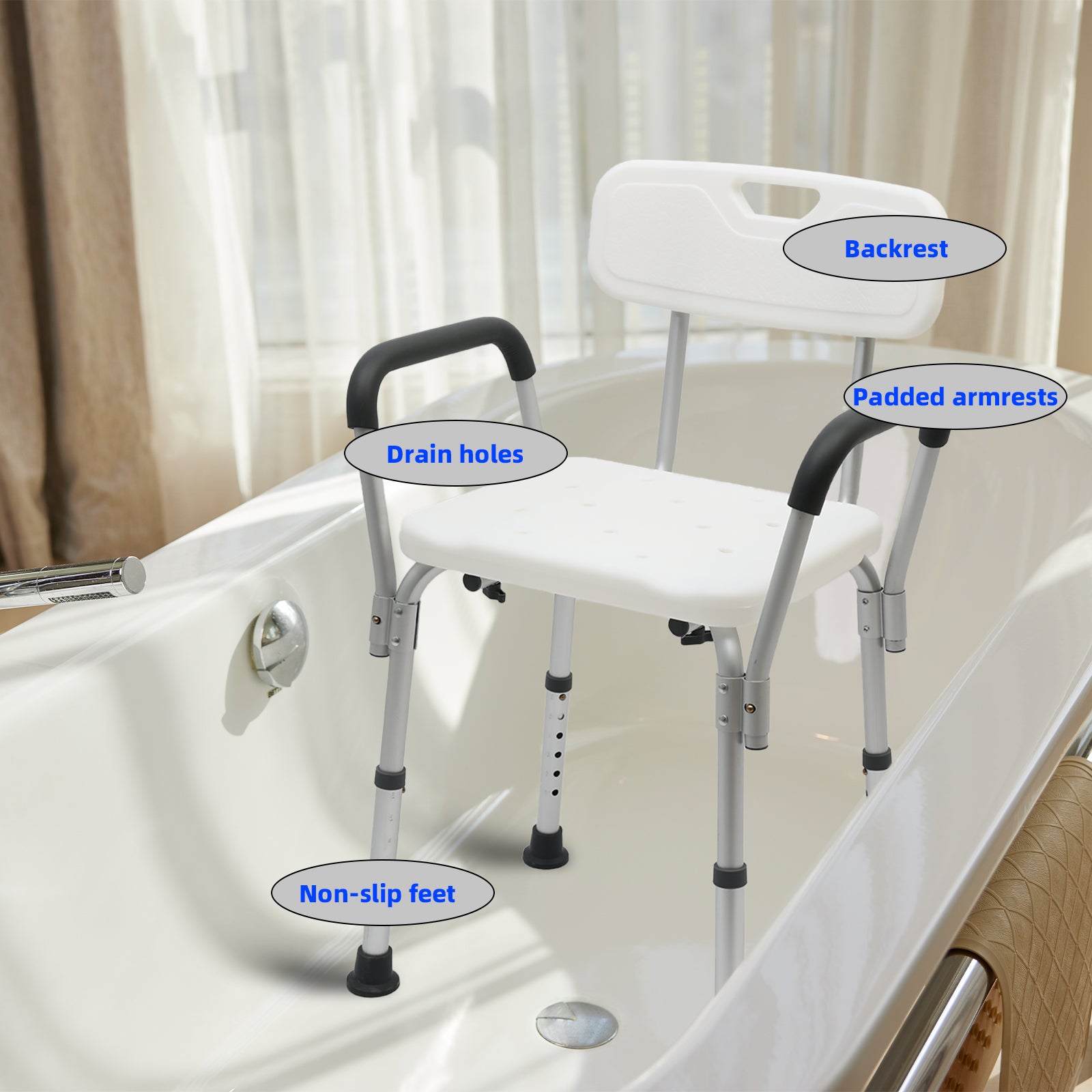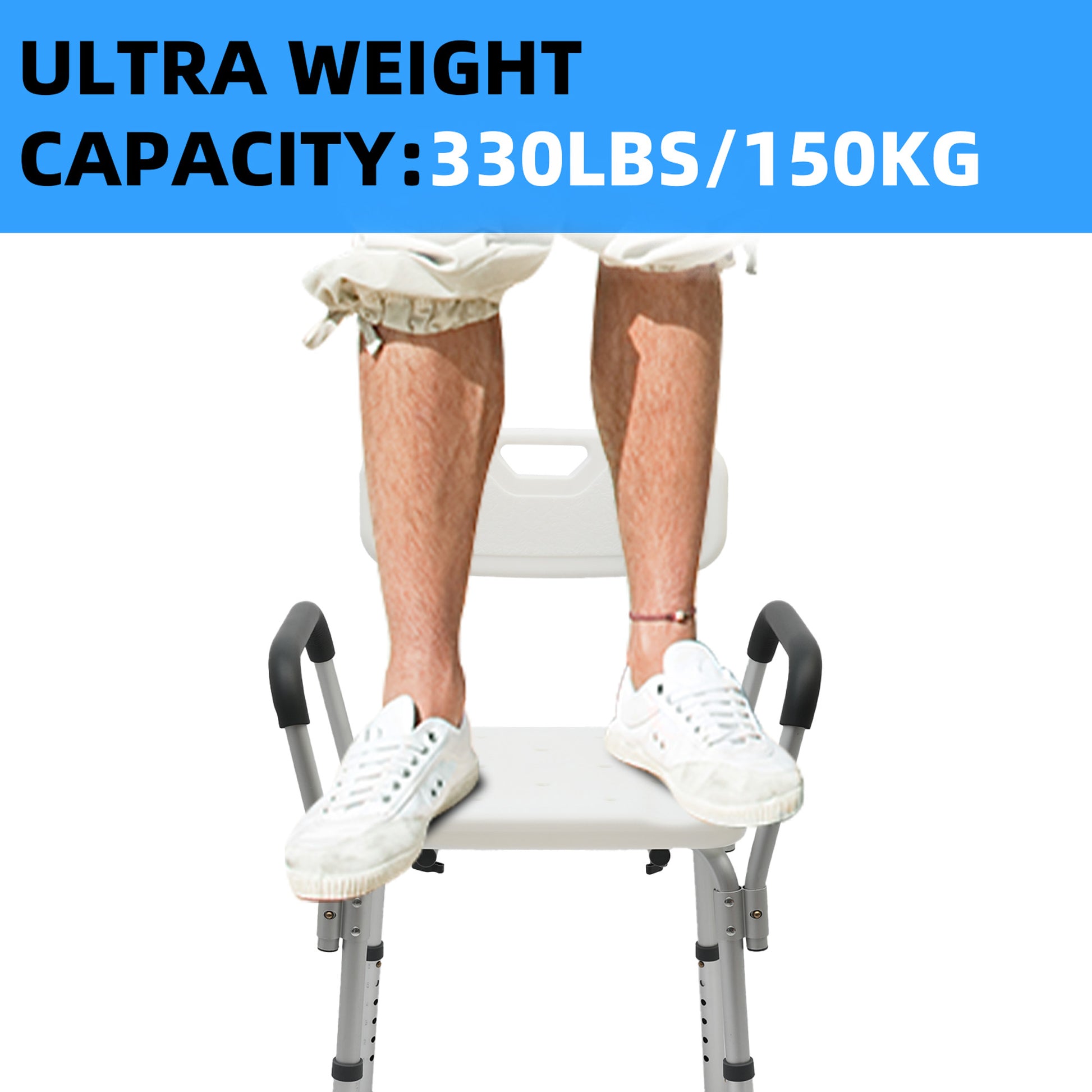 The Shower chairs with armrests and backrest that can hold up to 330 lbs.
