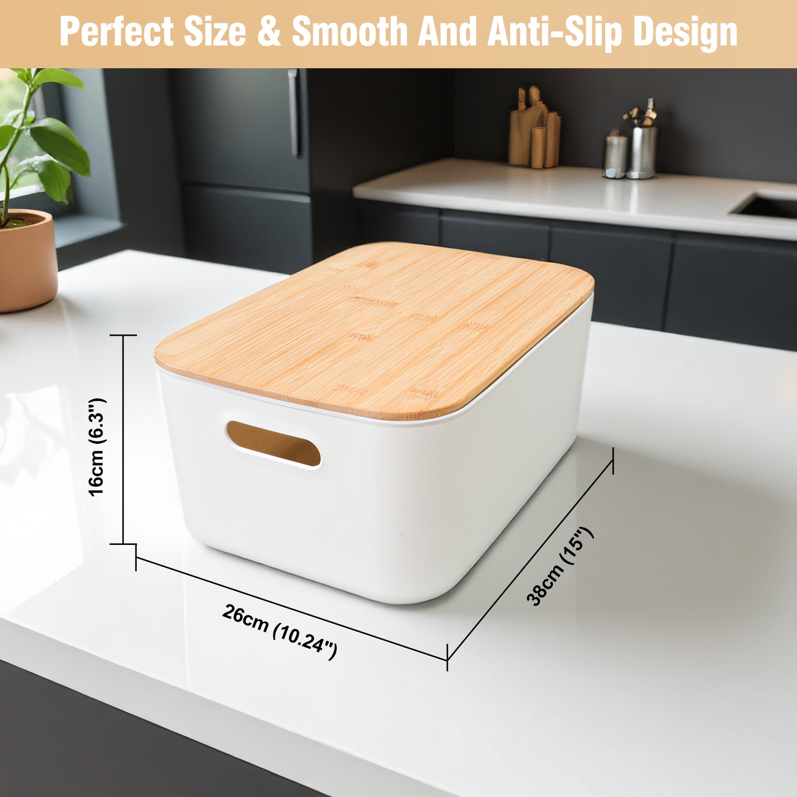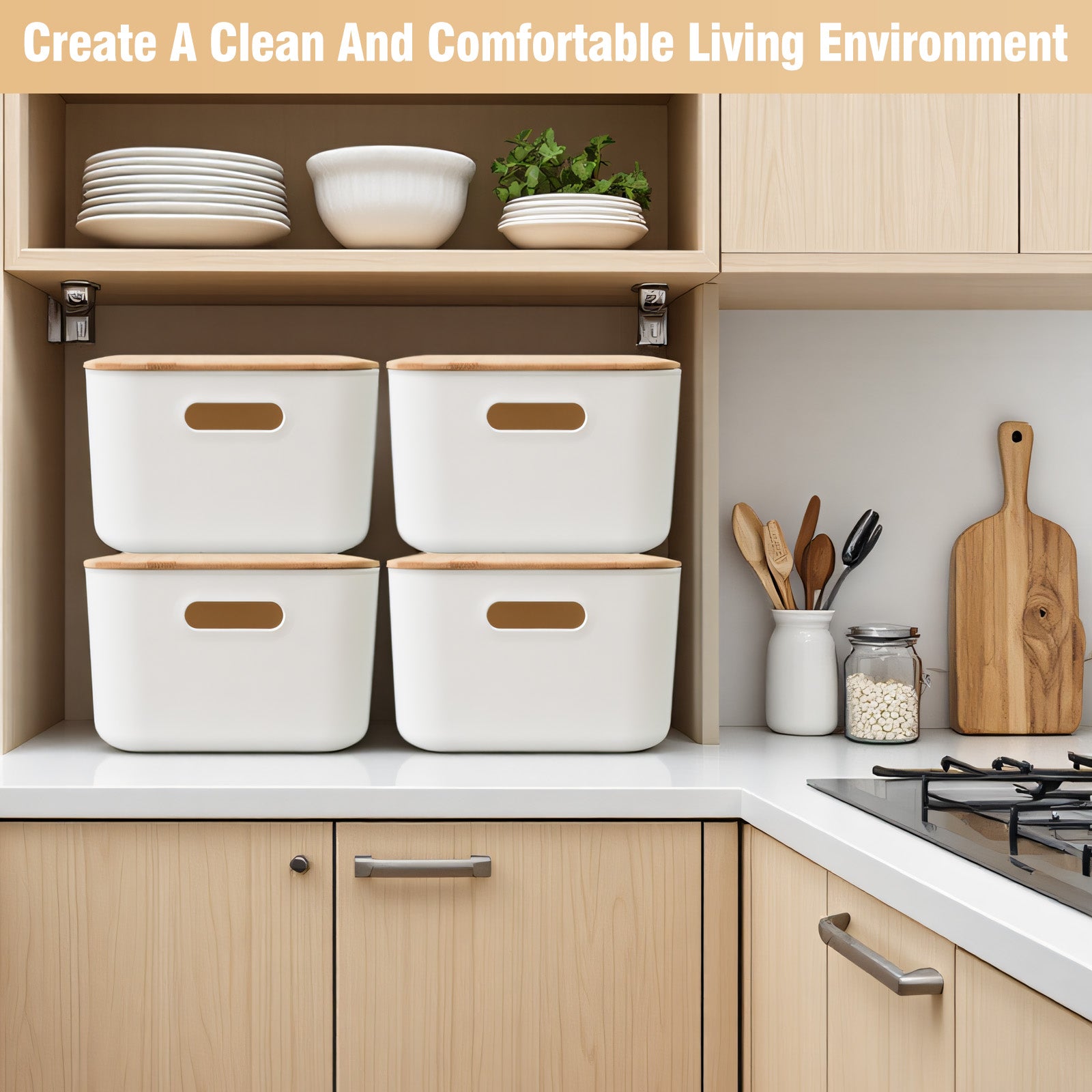 CATGOOD Storage Bins with Bamboo Lids 2 Pack, White Stackable Storage Bins with Lids for Kitchen, Cabinet, Bathroom, Plastic Storage Baskets, Premium Minimalist Boxes, 15"x10.24"x6.3"
