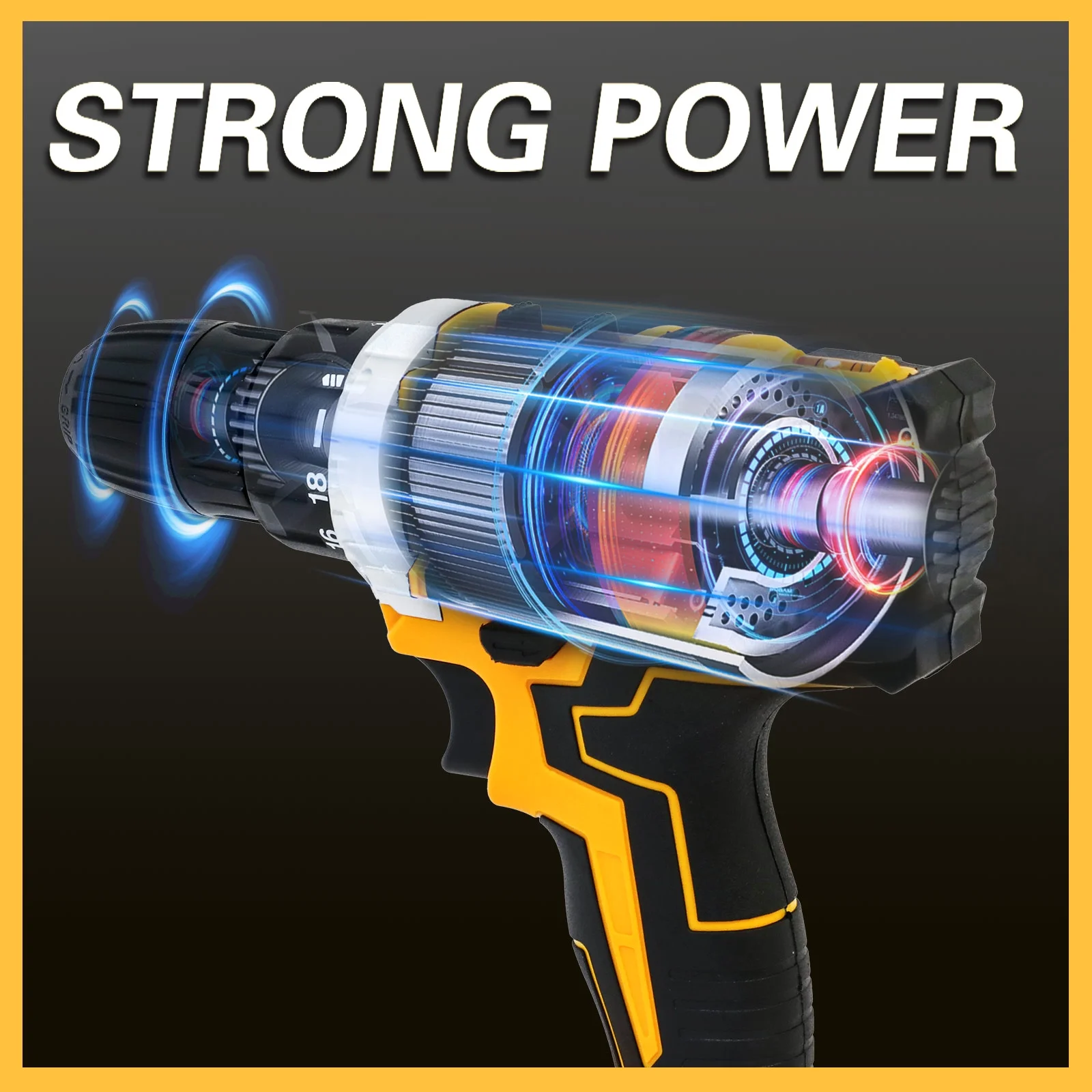 Equipped with a full copper motor, variable speed, and strong torque, this cordless drill delivers powerful performance and ease of use.