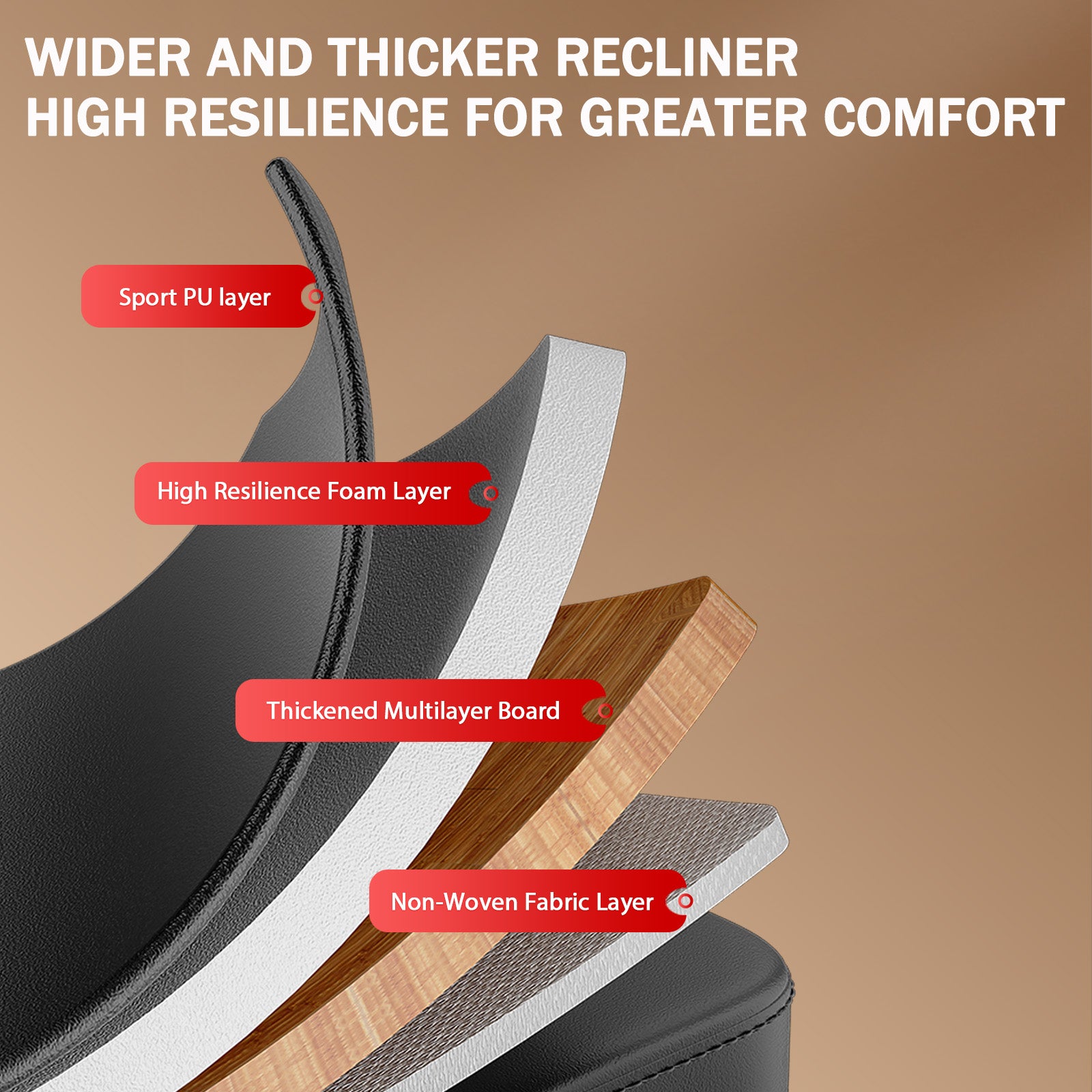 Up-graded thick backrest and seat are wrapped in high-quality waterproof PU leather with ultra-soft foam padding, providing an extremely comfortable experience.
