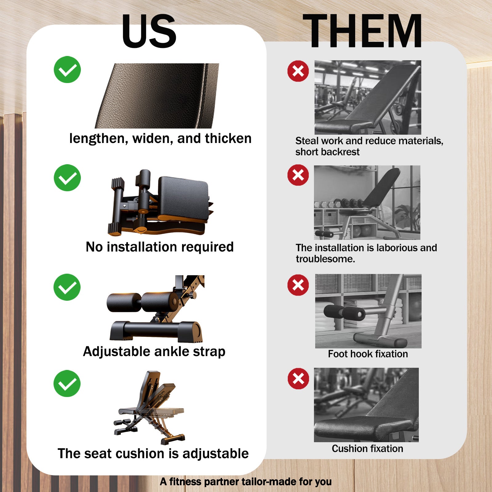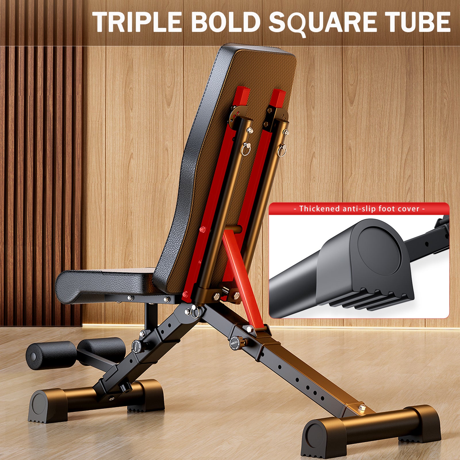 RICAN 8 in 1 weight bench is as steady as a mountain, featuring multiple triangular thickened steel supports, with a load capacity of up to 1000 lbs.