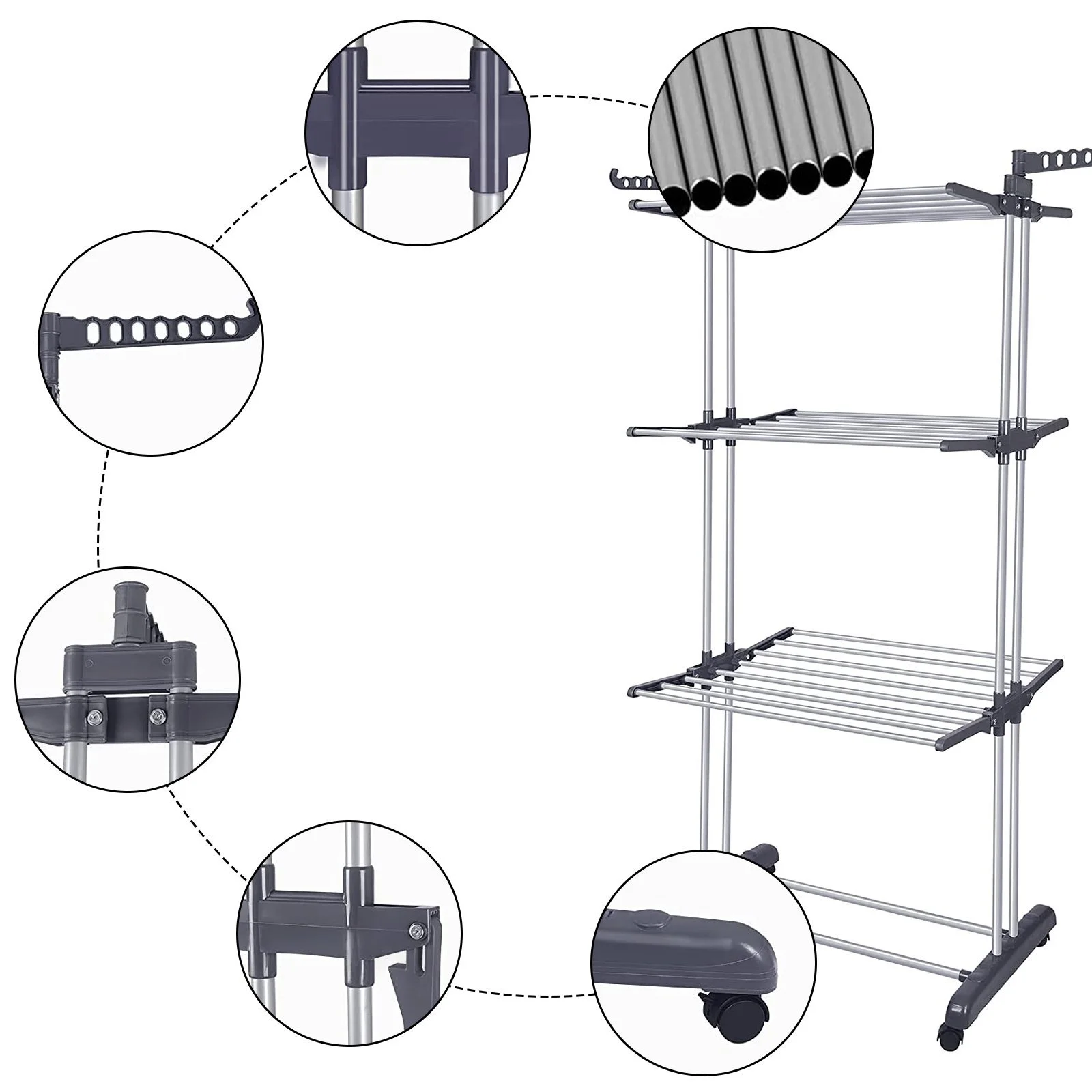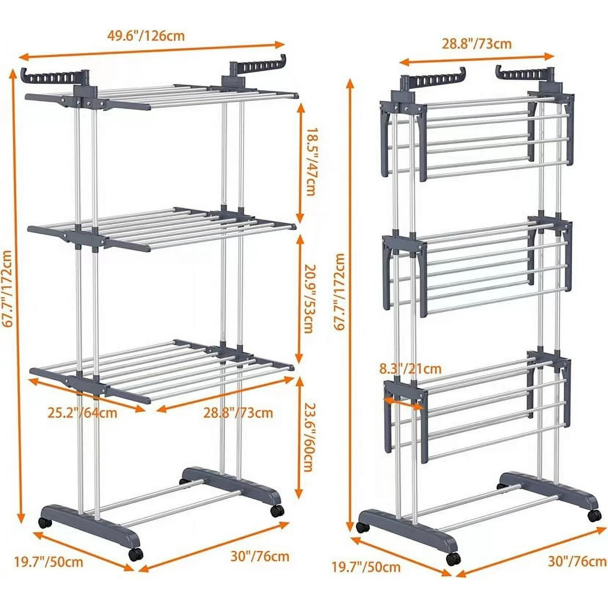 Clothes Drying Rack, 4 Tier Outdoor Laundry Drying Rack, Laundry Drying Rack with Foldable Wings Indoor, Gray