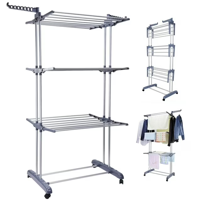 This practical and fashionable coat rack is a great multi purpose combination of coat hanger/airer and towel hanging rail. It features with large drying area and you can lay garments flat to help it dry in the sun quickly. Equipped with 4 movable pulleys, it is convenient to move the rack, which can be placed indoors and outdoors. Made of high-quality material, it is strong in bearing capacity, stable and durable. This item is also easy to use and simple to install.</p>
