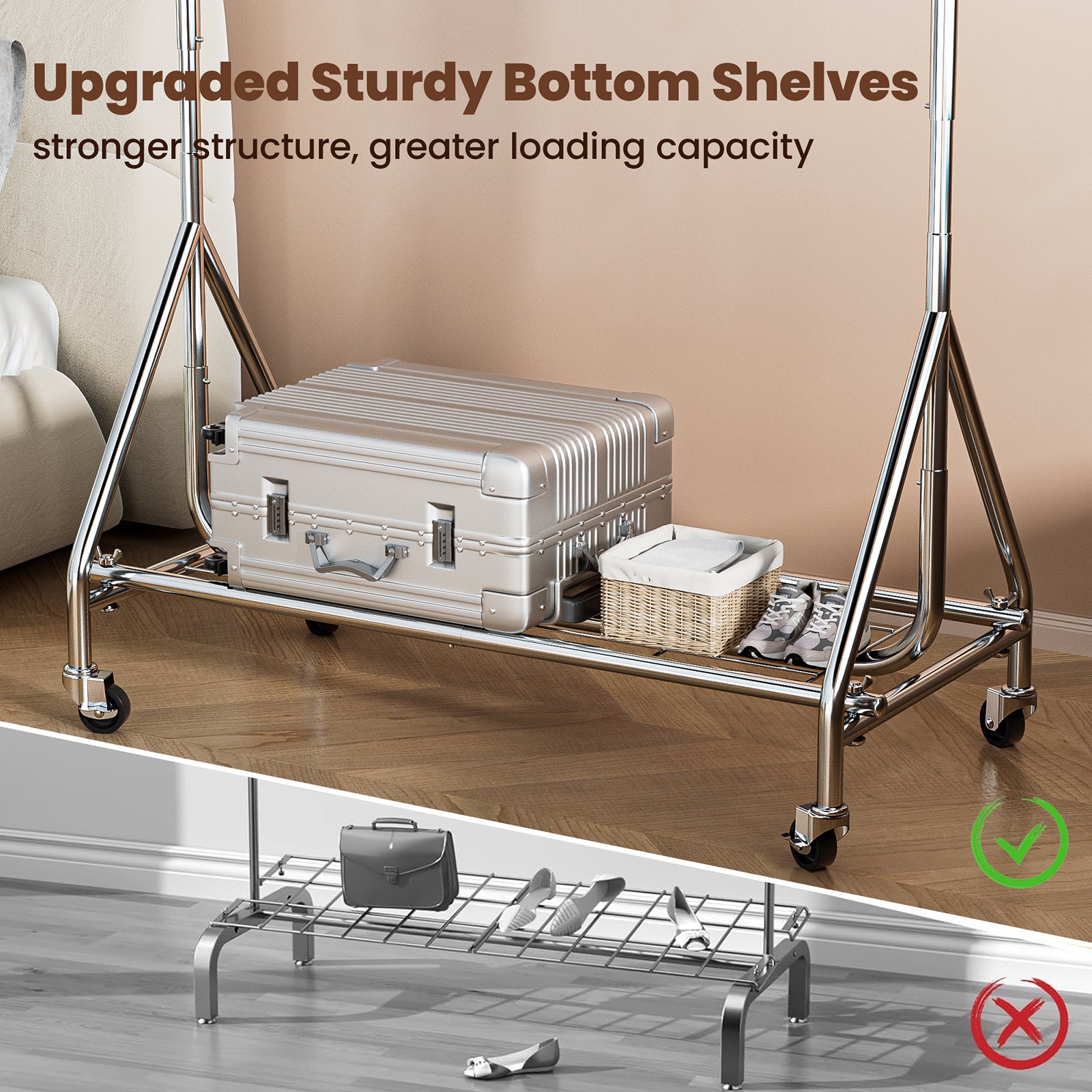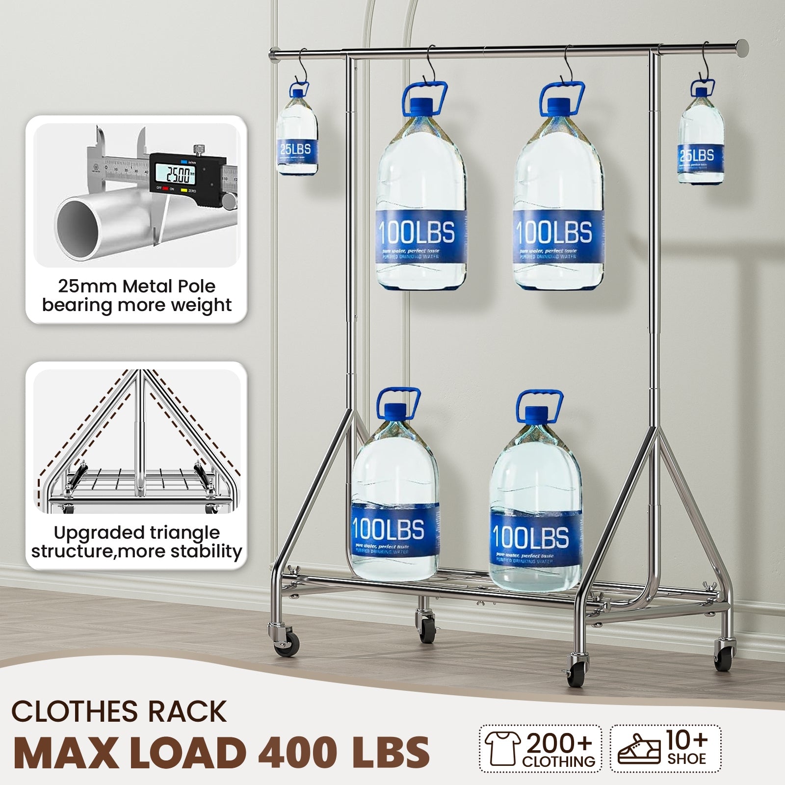 Clothes Rack Load 400 LBS, Metal Heavy Duty Clothes Rack, Free Standing Clothing Rack for Hanging Clothes with Sturdy Wheels & Shelves, Portable Closet Wardrobe Rack, Silver