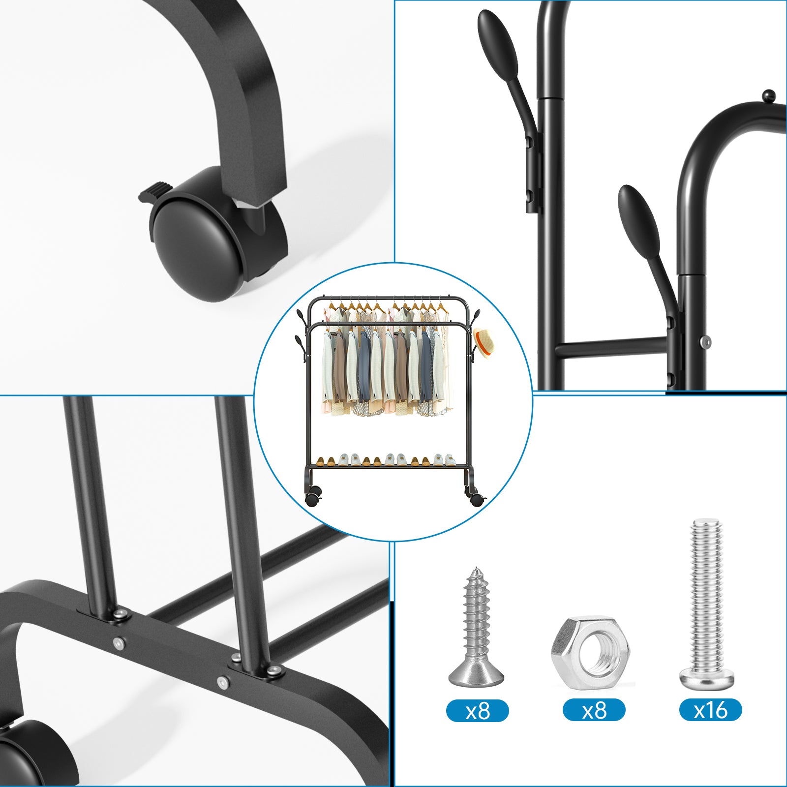 Clothes Rack with Wheels, Double Rods Clothing Rack for Hanging Clothes, Heavy Duty Garment Racks for Hanging Clothes, 4 Hooks, Multi-functional Bedroom Clothes Rack, Black