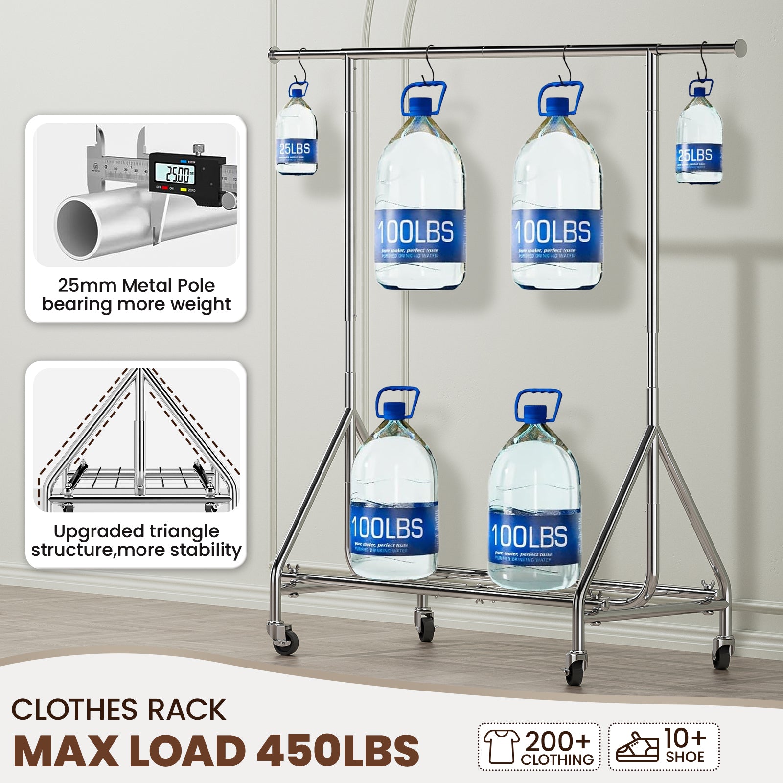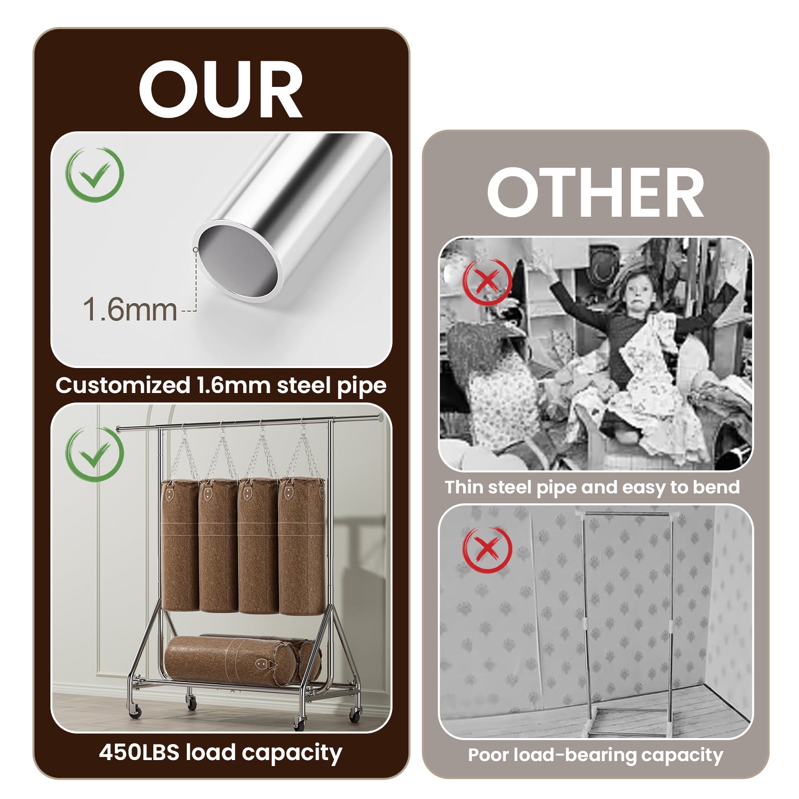 - This heavy duty metal clothes rack perfectly combines quality and practicality. Made from top grade steel, it can support up to 350 lbs,effortlessly handling heavy clothing.