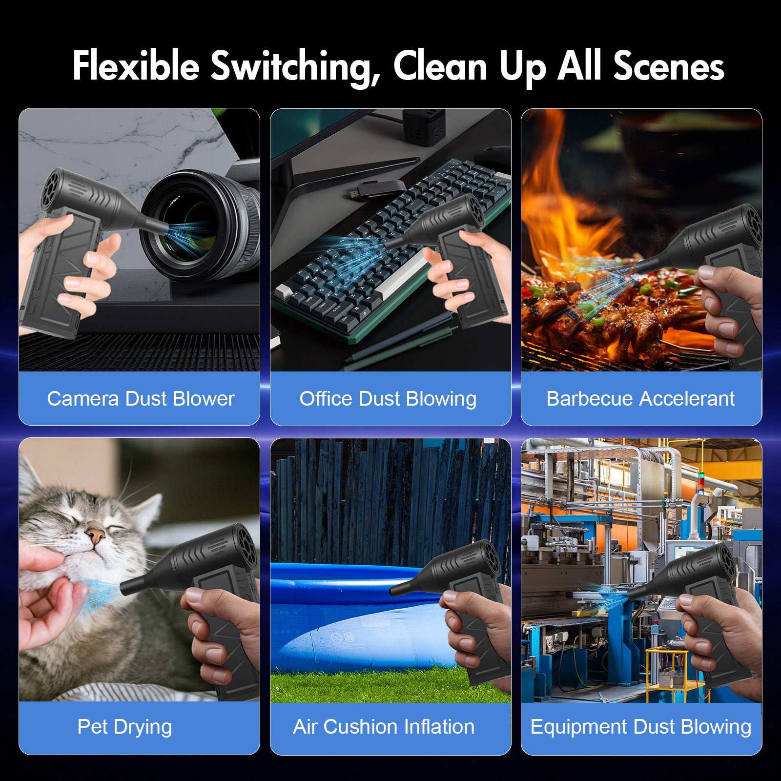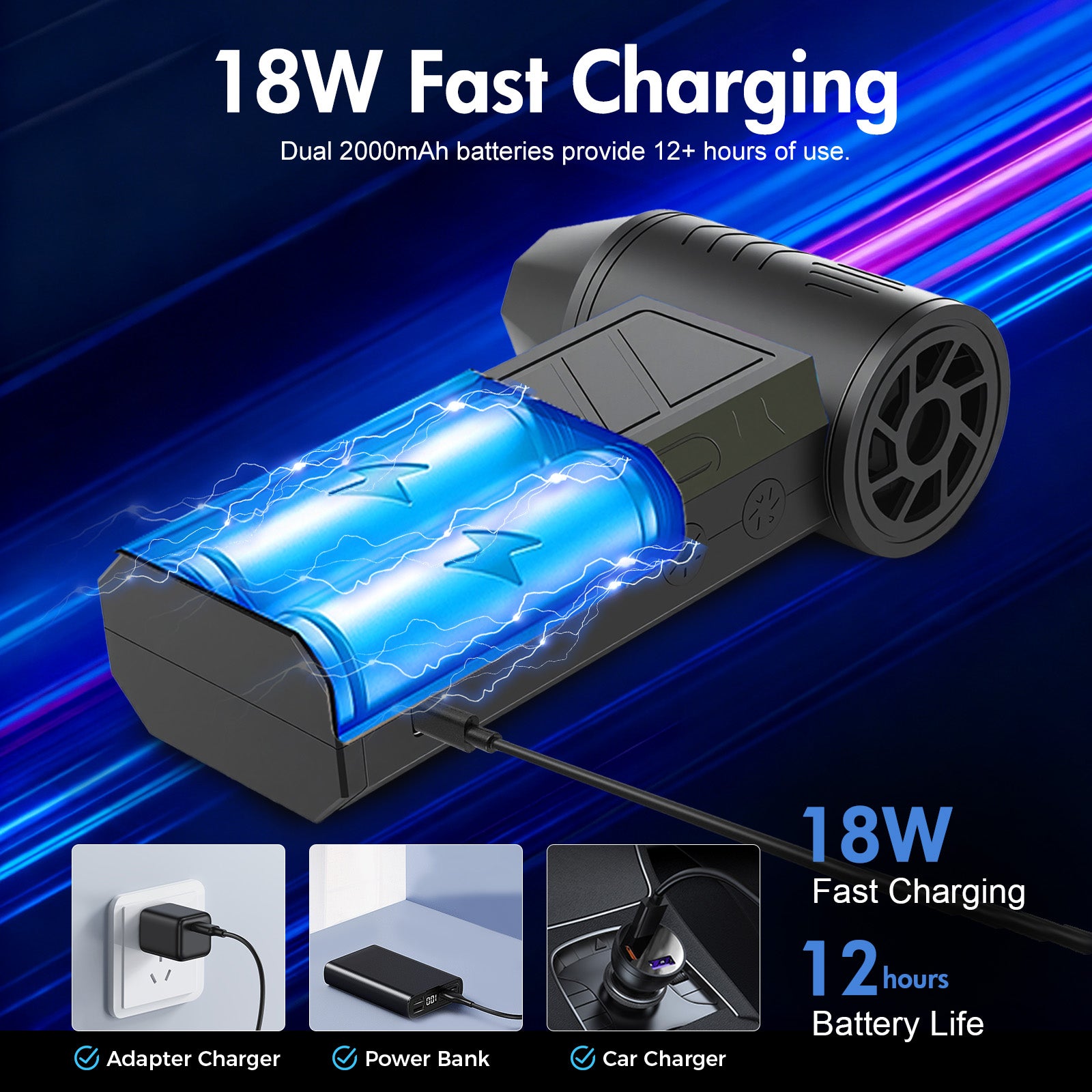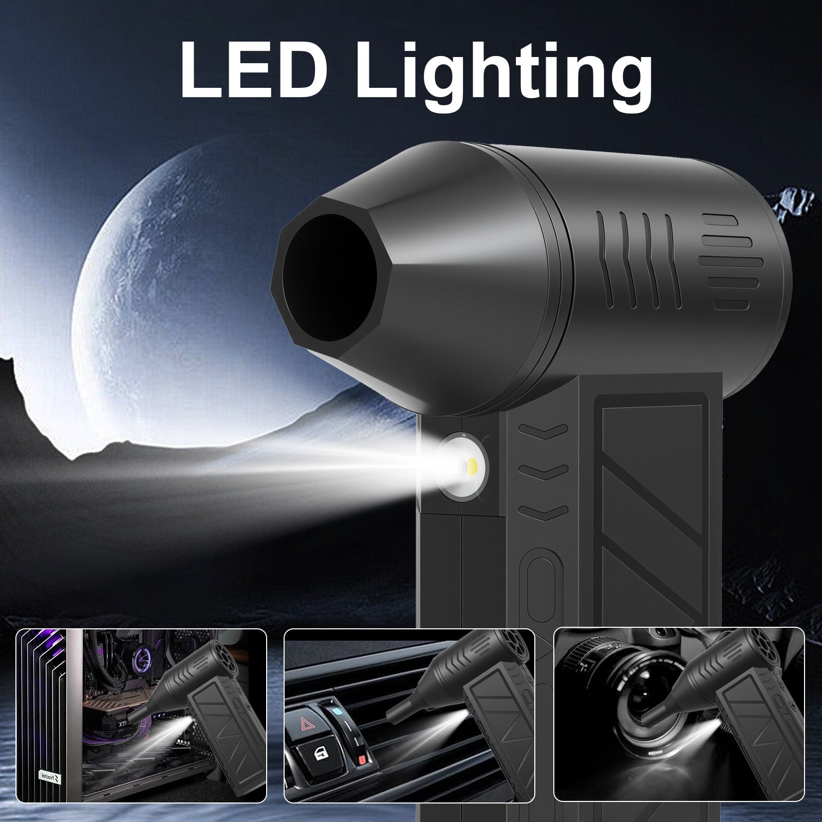 Upgrade your cleaning game with our high-speed electric air duster. Powered by a robust 180,000 RPM motor, it generates a powerful airflow to effortlessly remove stubborn dust and debris from hard to reach places. With three adjustable wind speeds, it adapts to various tasks from delicate electronics like keyboards and cameras to cars and household corners.Featuring dual 2000mAh batteries and Type C fast charging, it delivers up to 12 hours of continuous runtime. Weighing just 255g lighter than an apple and operating at a quiet 60 dB, this compact tool is your go-to solution for efficient, portable cleaning. Say goodbye to messy wipes and hello to professional-grade cleanliness.