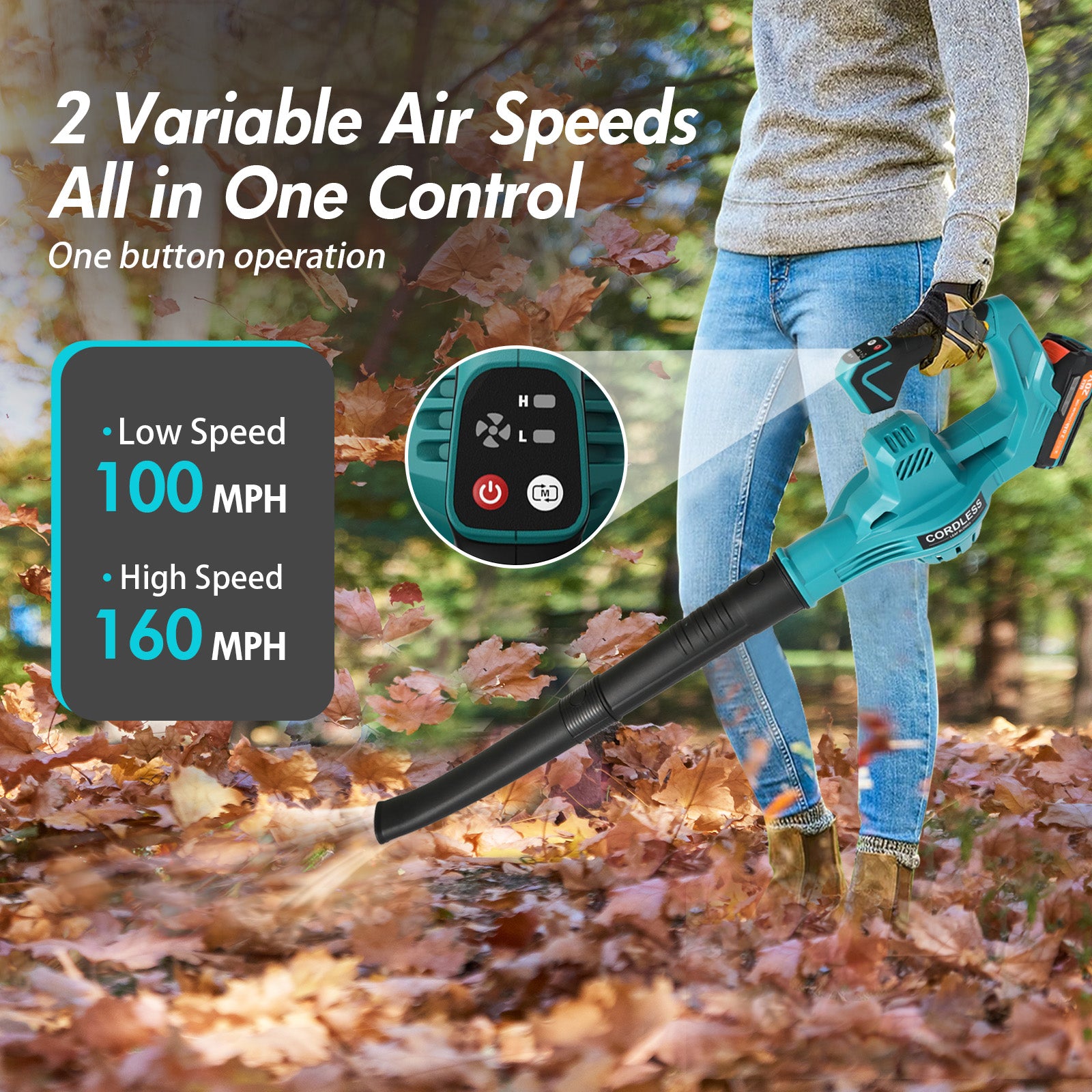 This mini cordless leaf blower, equipped with advanced turbocharging technology, features a core 19,500 RPM powerful motor that acts like the eye of a mini storm. It releases an astounding 160 MPH wind speed, effortlessly sweeping away even the most stubborn leaves and debris, giving you a clean and unobstructed outdoor space.