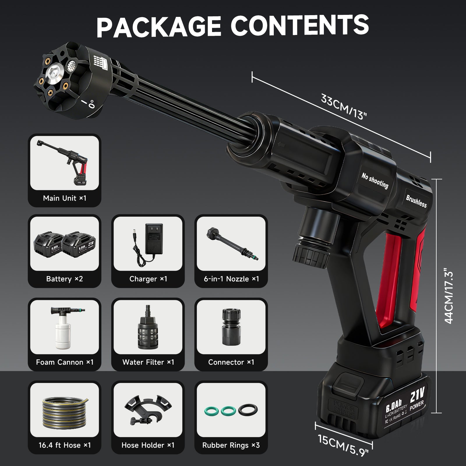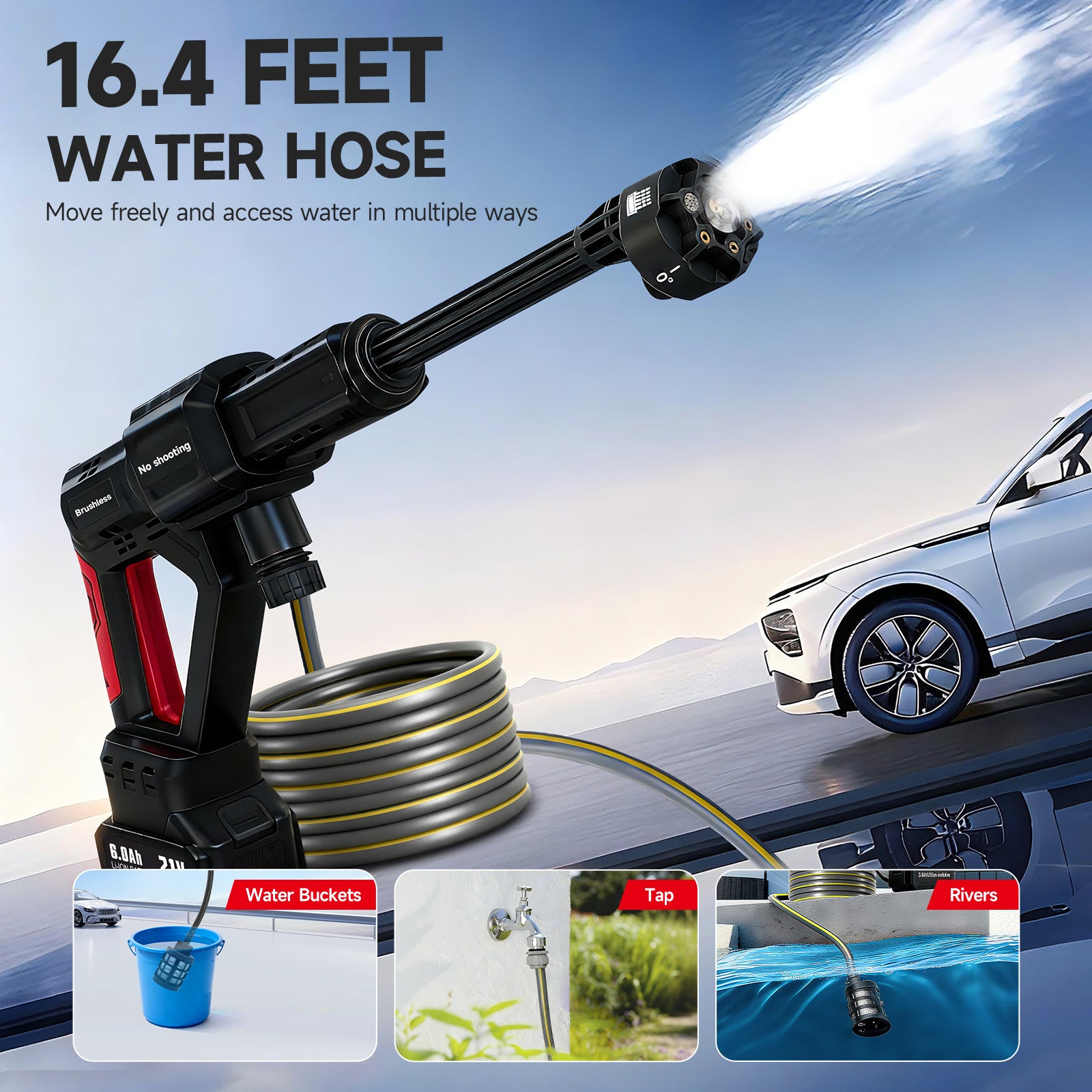 Revolutionize your cleaning routine with this powerful cordless pressure washer! Equipped with a robust 330W brushless motor, it delivers an impressive 1060 PSI of pressure and 2.8 GPM water flow, projecting water up to 27 feet. Clean second-story windows and eaves effortlessly--no ladder needed!The 3-speed adjustment and intuitive touchscreen let you customize pressure for any task, while the 6-in-1 multifunctional nozzle switches between spray patterns (0deg to 40deg) with a simple twist. Tackle stubborn grime on driveways or gently rinse your car with ease.Powered by a 21V 6.0Ah rechargeable battery, enjoy up to 90 minutes of continuous runtime on just a 1-2 hour charge. The 16.4-foot kink-resistant hose features a weighted filter to block debris and supports multiple water sources--from taps to rivers, lakes, or even water bottles.Weighing only 2.2 lbs and including a portable storage case, this washer assembles in minutes and is beginner-friendly. Perfect for cars, patios, pools, fences, and more--ts the ultimate cleaning companion for every corner of your home!