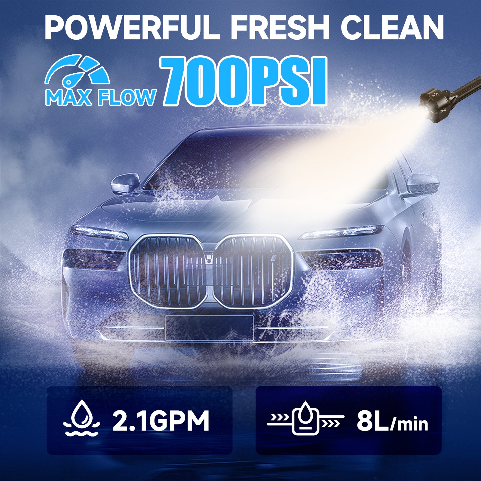 Meet your new cleaning partner! This 21V cordless pressure washer delivers outstanding performance with a powerful 380W brushless copper motor, generating 700PSI high pressure and 8L/min water flow to blast away stubborn dirt effortlessly. The innovative 6-in-1 adjustable nozzle lets you switch between 0deg to 40deg spray patterns instantly, while the included foam cannon produces rich suds for pre-wash treatment. With a 16.4ft extended hose and built-in filter, you can draw water directly from buckets, lakes, or other sources-no tap needed. Lightweight and completely cordless, it's your go-anywhere cleaning machine. Perfect for cars, patios, outdoor gear, and more-bring the power of professional cleaning wherever you go!