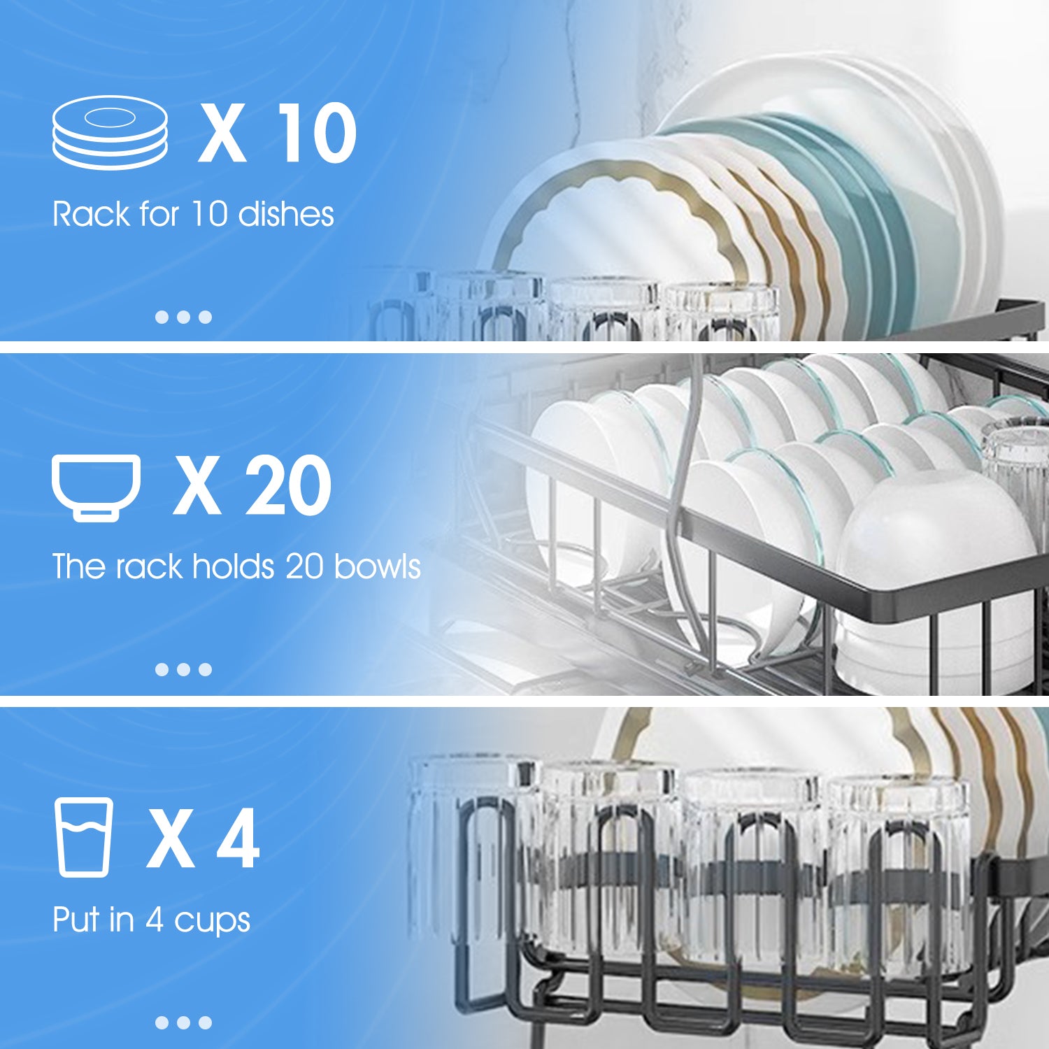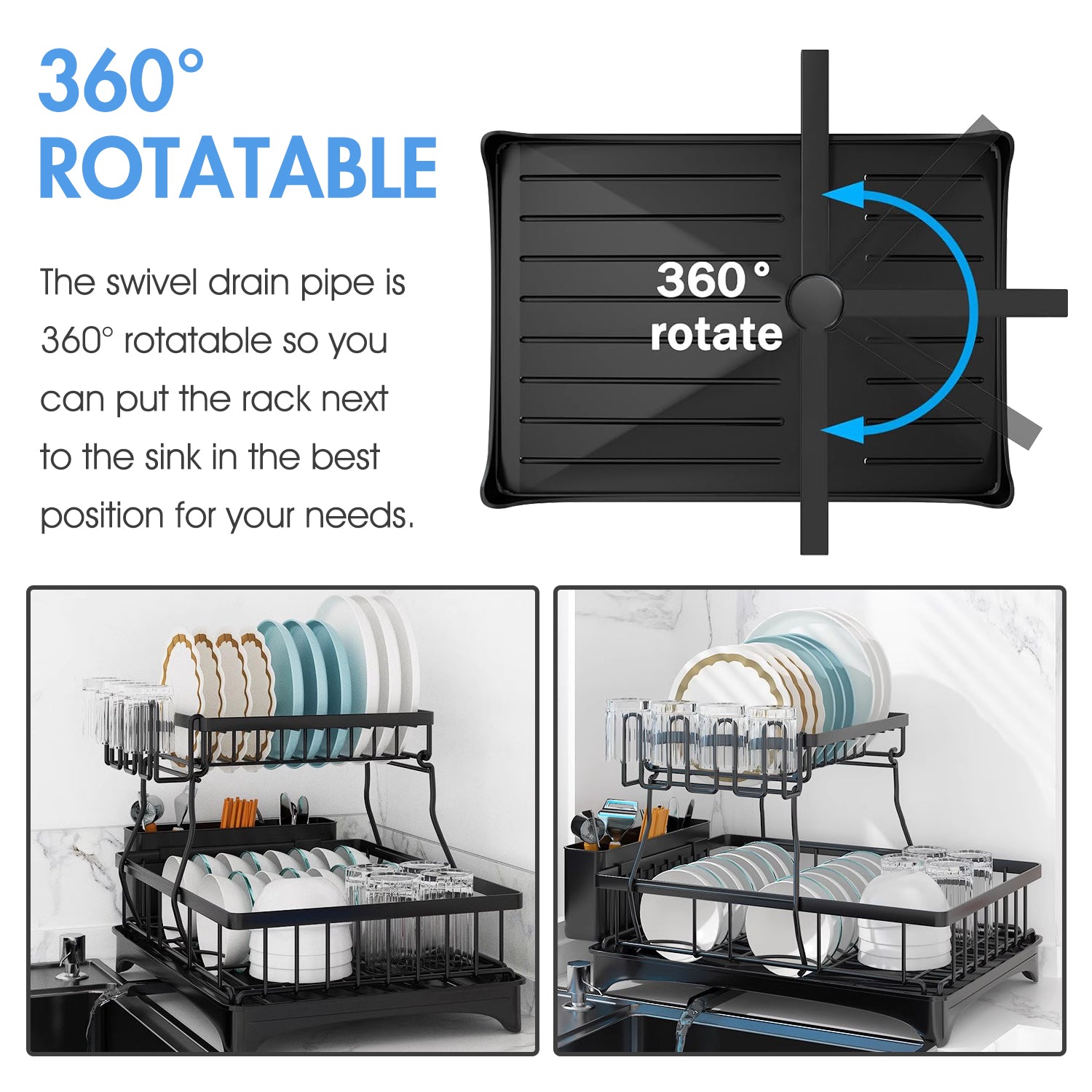 This 2-tier dish rack is made from heavy-duty carbon steel, capable of holding lots of dishes and utensils. This drying rack helps you store and dry your kitchenware orderly, making your countertop dry and neat all the time. And you can also fetch what you need easily. Featuring a compact size, this drying rack saves more space for the countertop.