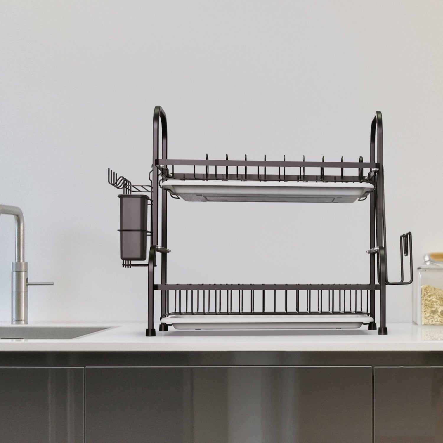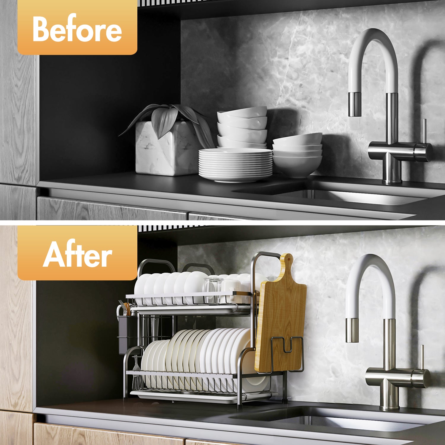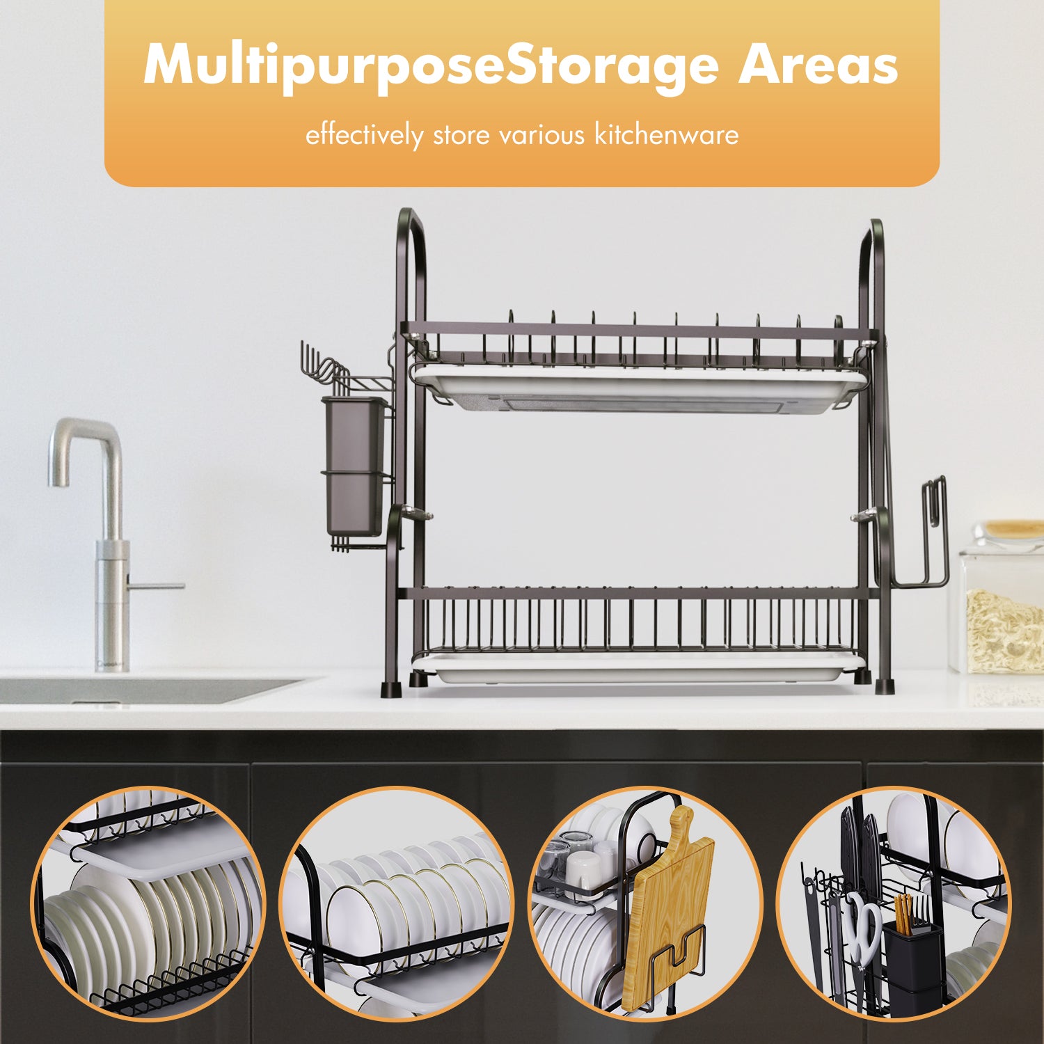 This 2-tier dish rack is made from heavy-duty carbon steel, capable of holding lots of dishes and utensils. This drying rack helps you store and dry your kitchenware orderly, making your countertop dry and neat all the time. And you can also fetch what you need easily. Featuring a compact size, this drying rack saves more space for the countertop.