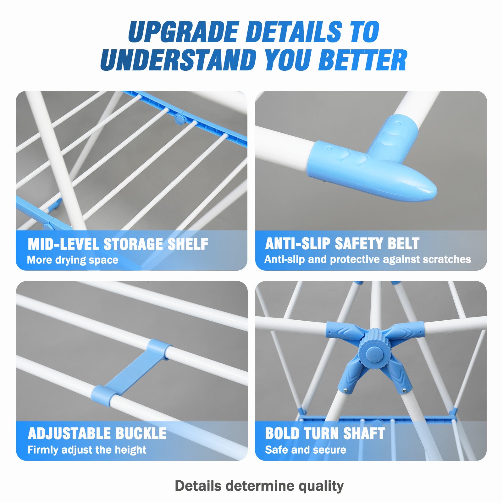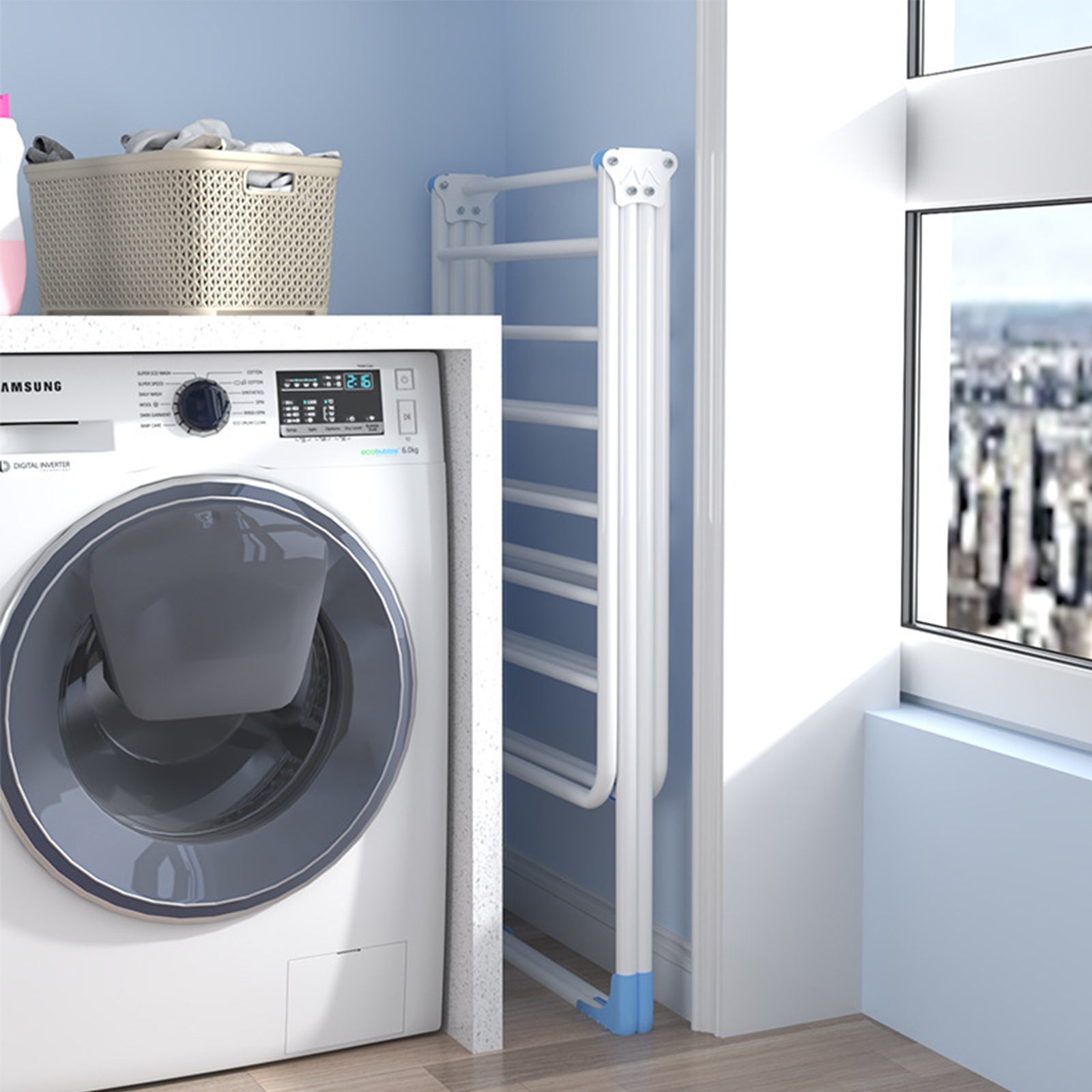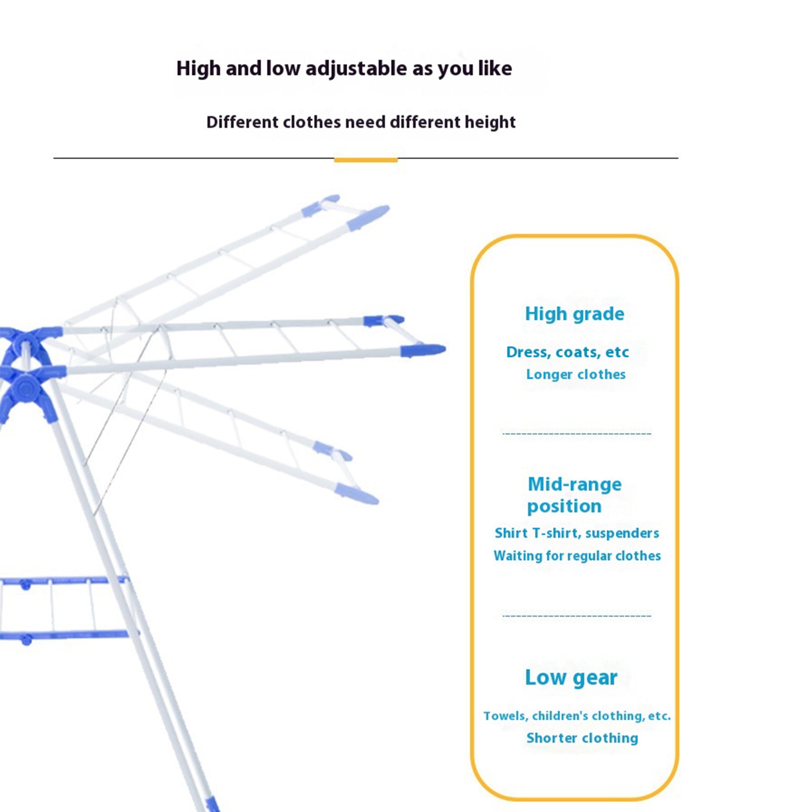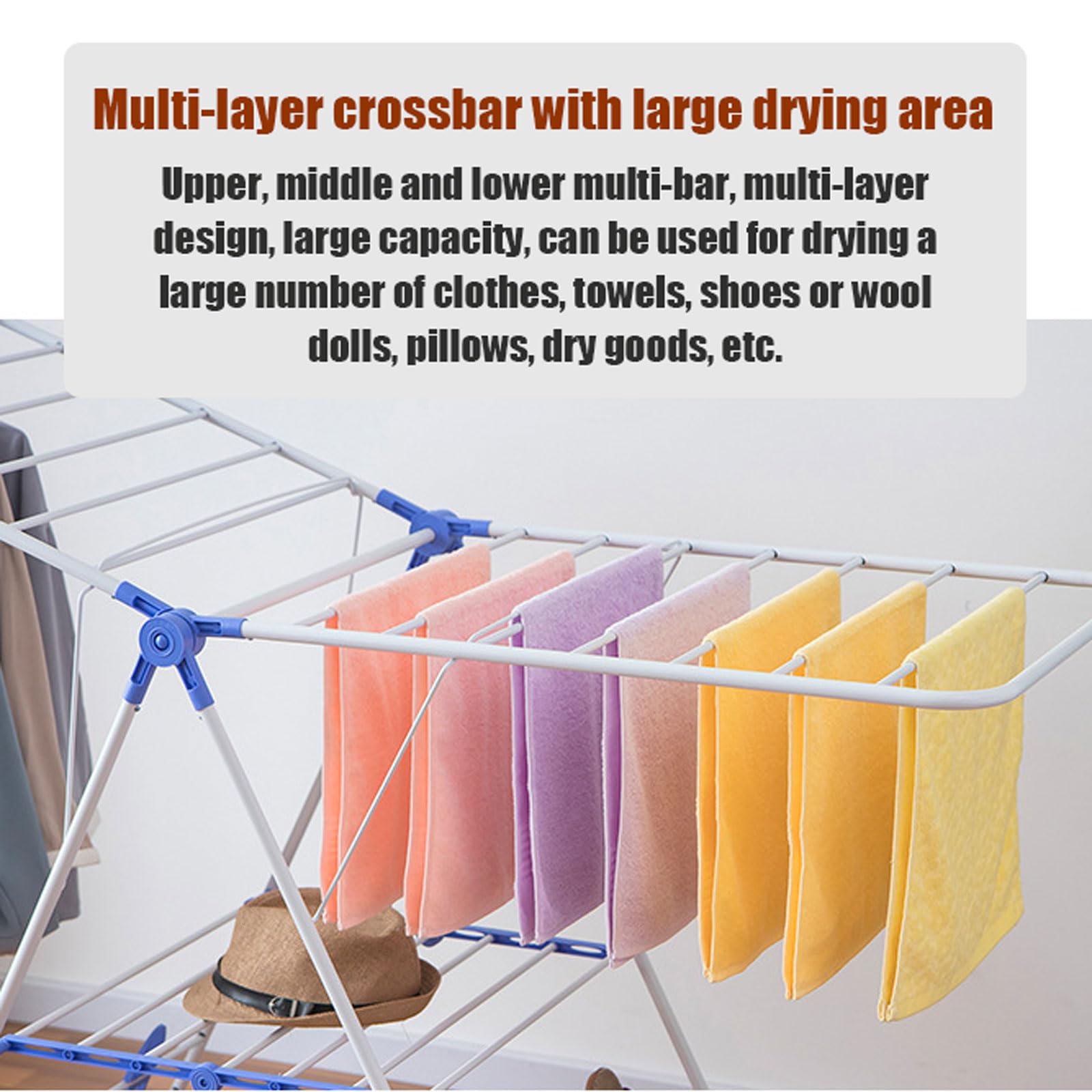 This compact foldable clothes rack combines spacious drying space with convenient storage, requiring no complex installation for immediate use. The height is fully adjustable to meet various height requirements for a more comfortable drying experience. Made from high-quality PP material, it offers excellent load-bearing capacity and maintains a like-new appearance even after long-term use. The wide spacing between rods speeds up drying, making it suitable for various weather conditions, enhancing drying efficiency. This wing-style foldable clothes rack is the ideal choice for drying your clothes.