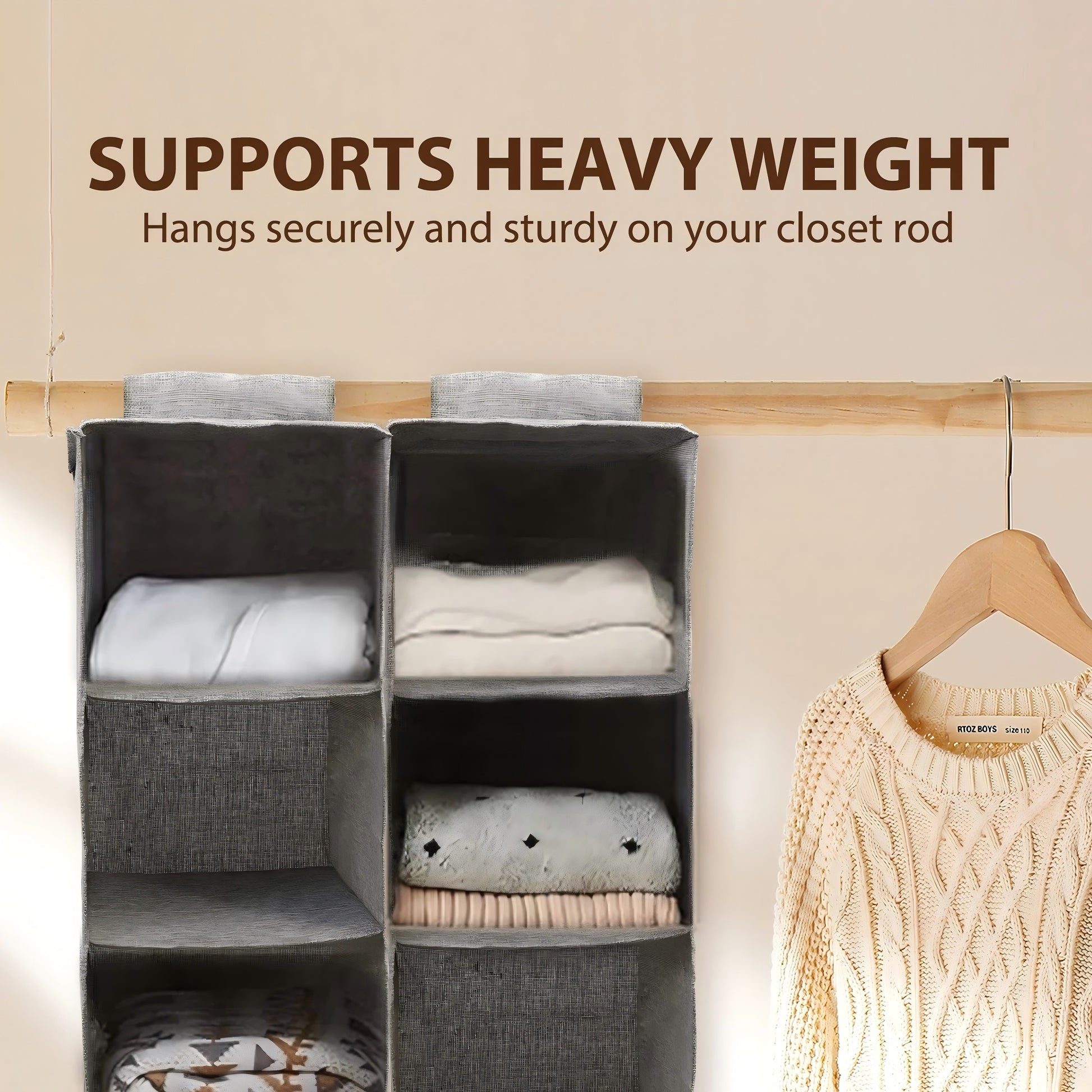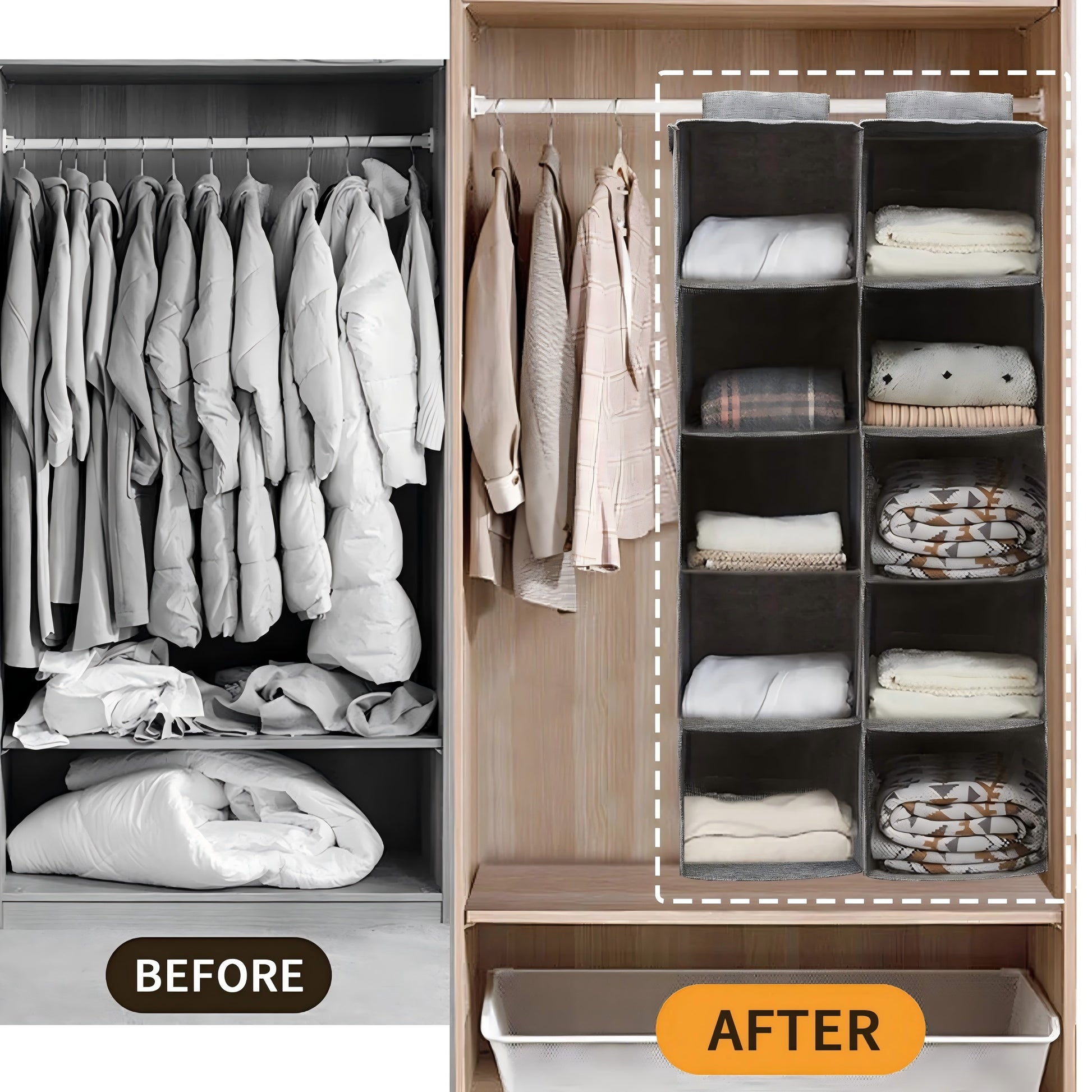 This grey five-tier wardrobe storage hanging bag is designed in cotton and linen to provide more storage space while saving space and keeping your wardrobe neat and organised. The Storage Hanging Bag makes the most of your space by utilizing vertical space in your closet to maximize capacity and add convenience, so you can store bulky sweaters, shirts, pants, handbags, purses, and more. This wardrobe storage hanging bag will be your wardrobe's right-hand man, making your life more convenient and organized.