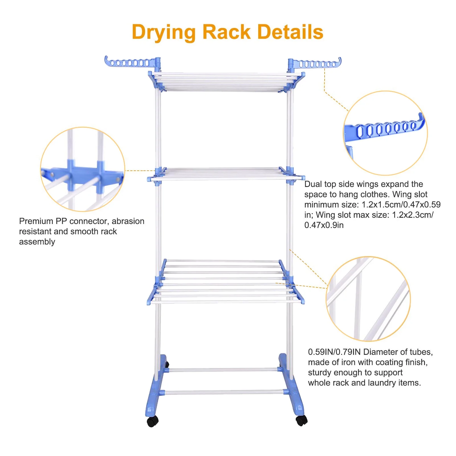 Homemart Clothes Drying Rack, 4-Tier Foldable Laundry Drying Rack, Stainless Steel Garment Clothes Dryer Indoor or Outdoor Standing Clothing Rack with Wheels, Blue