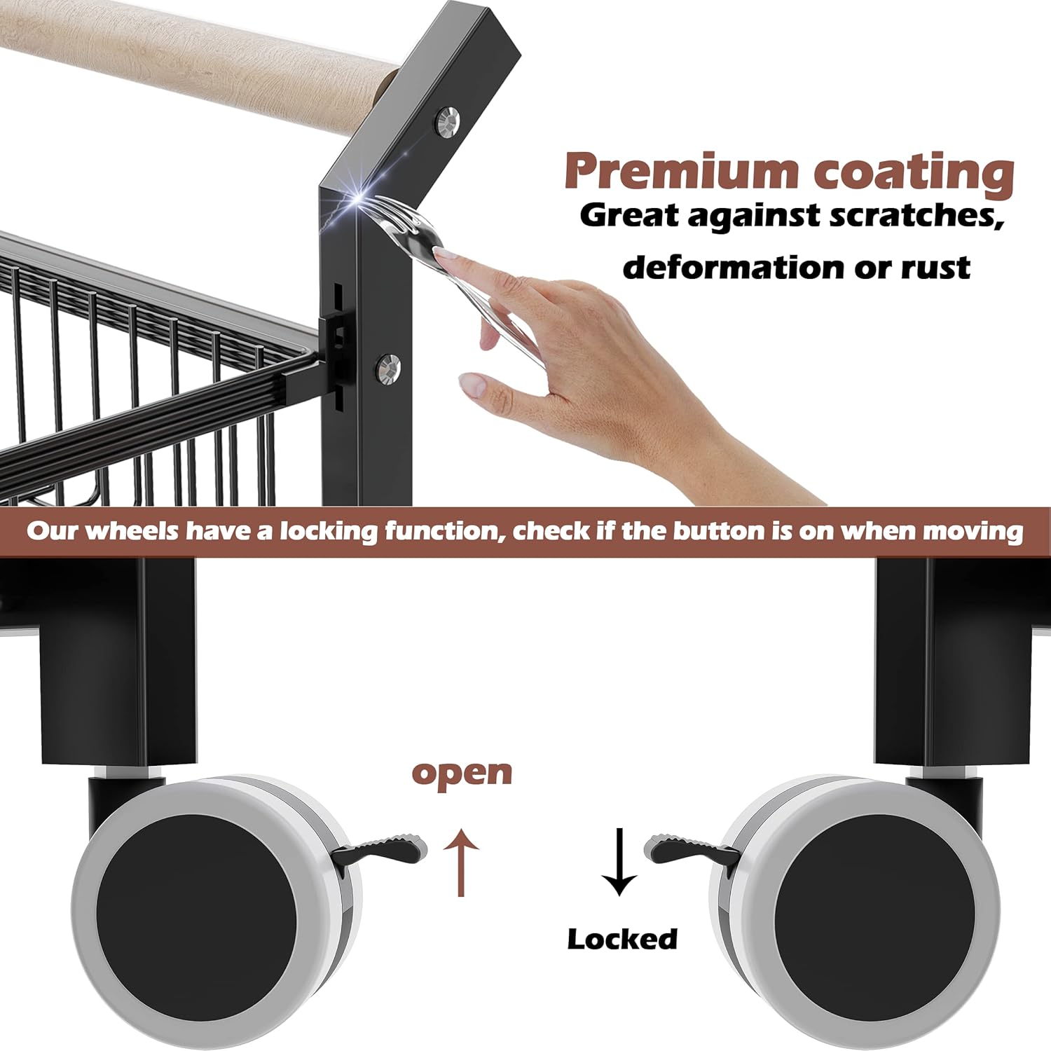 This cart with solid wooden handle and 4 360-degree movable Universal wheel design (2 can be stuck). Fruit basket is made of high-quality durable rustproof metal. The rustproof surface is with black coated finish. For sturdy and durability, not easy to deform.