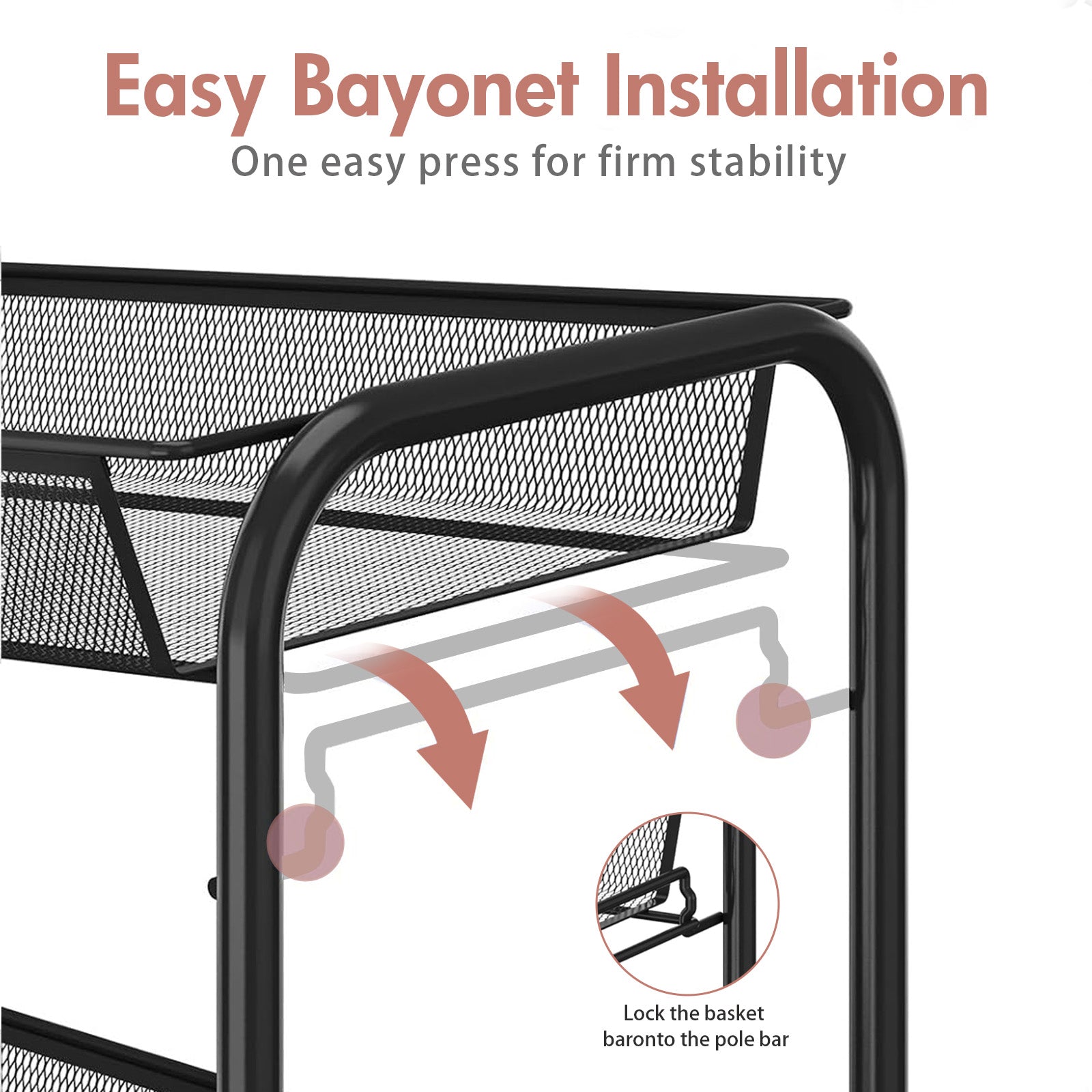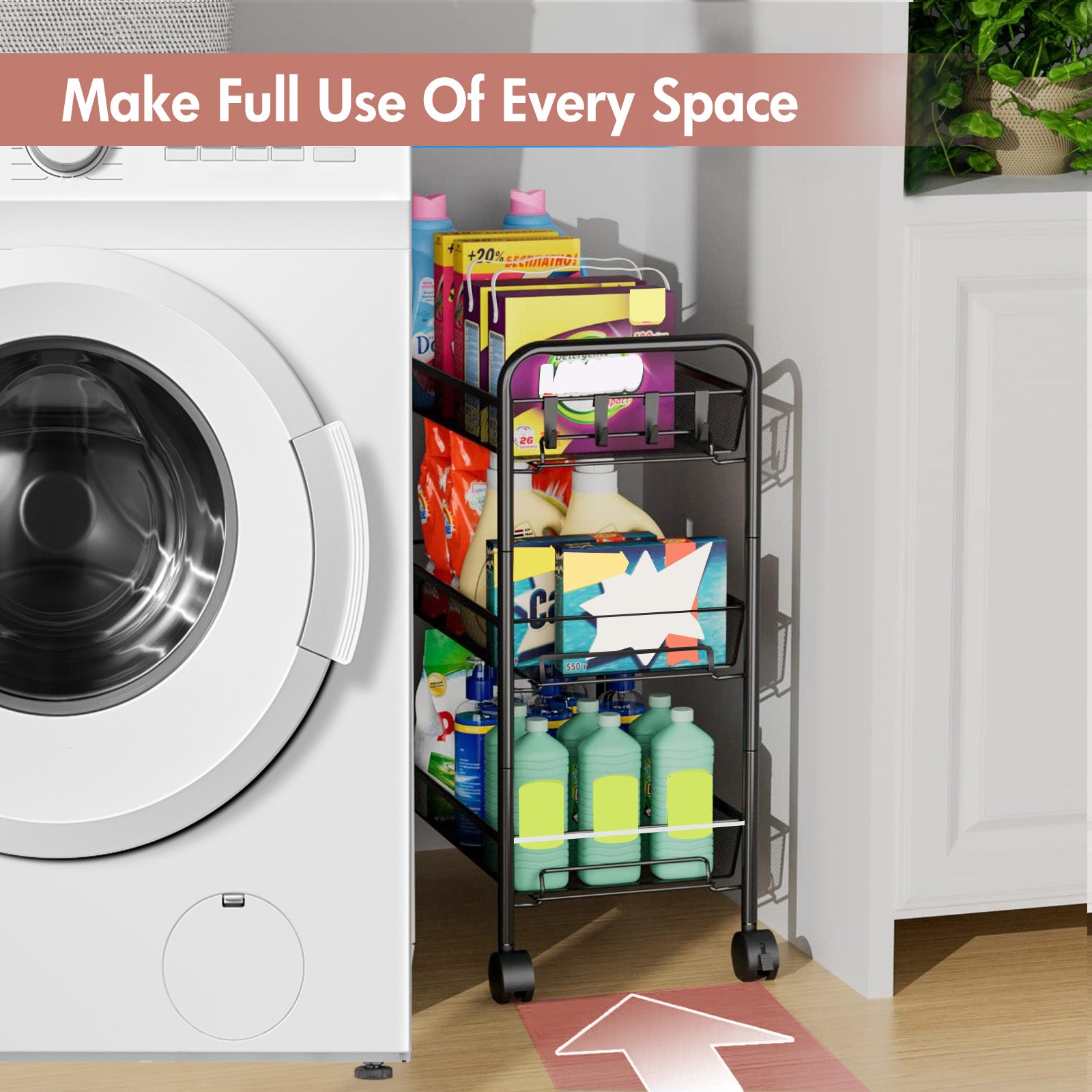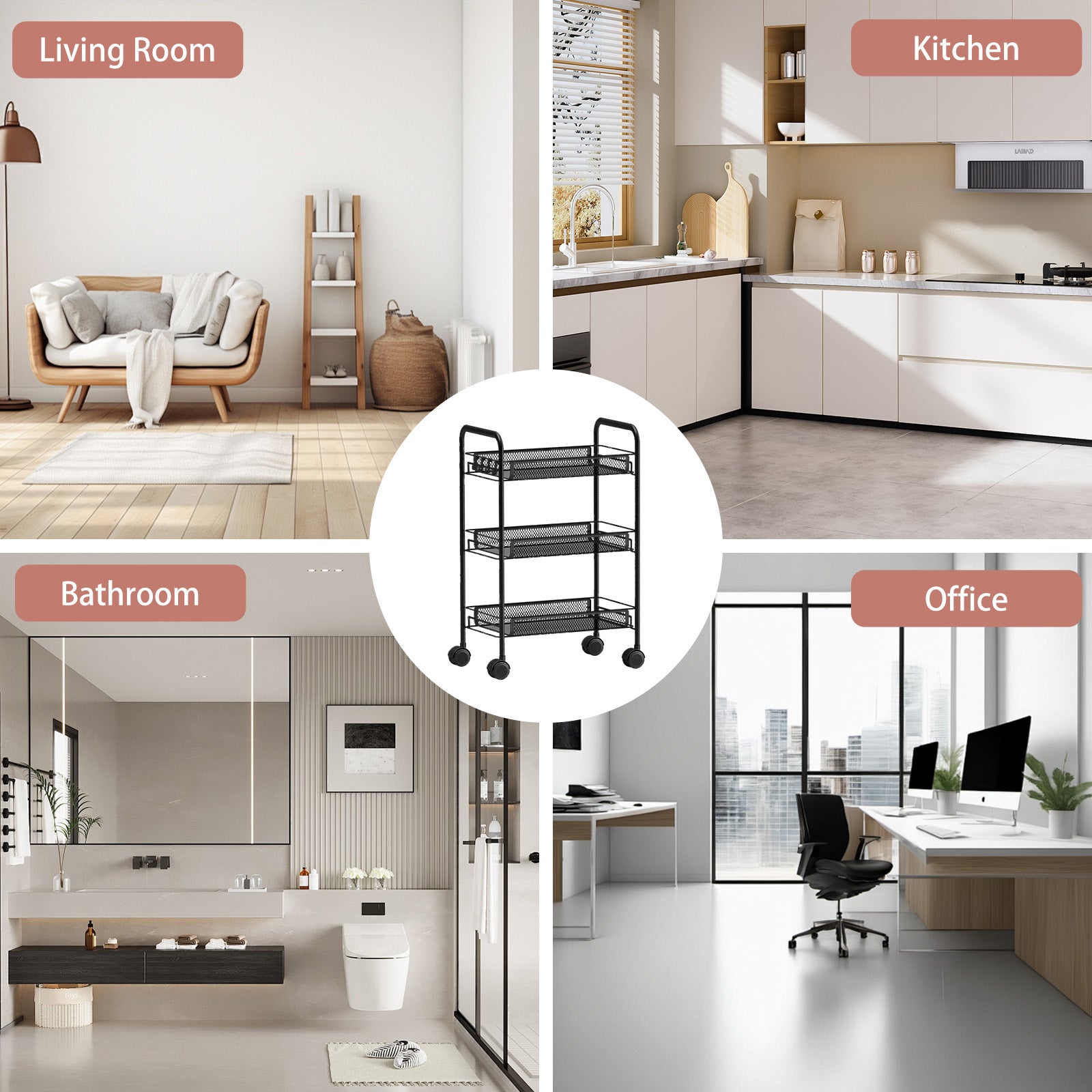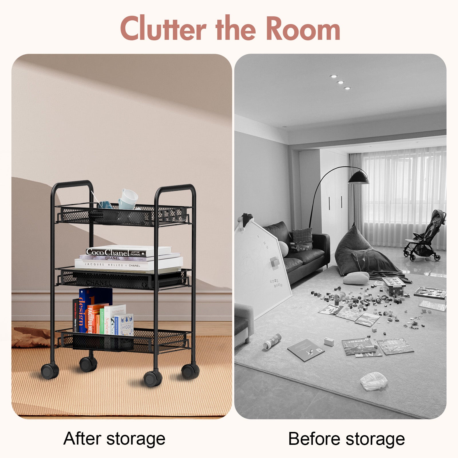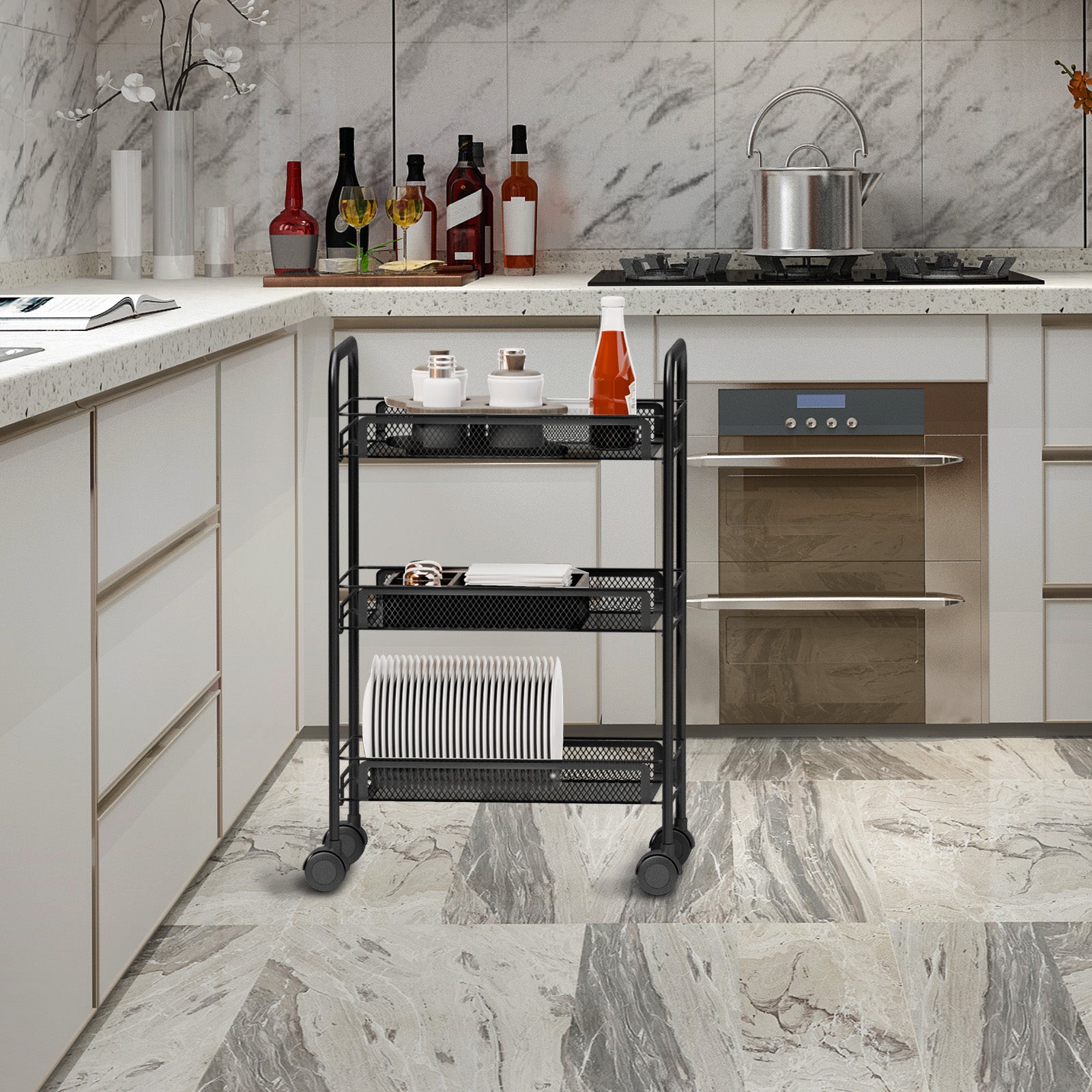 This 3-tier rolling cart with wheels features a tool-free assembly design, allowing you to set it up quickly and easily in just 5 minutes. Equipped with four wheels (two lockable) and 360-degree swivel casters, it moves smoothly and quietly, protecting your floors. Whether in the kitchen, living room, bathroom, or bedroom, this rack fits perfectly, meeting all your storage needs and bringing a fresh, organized look to your home.