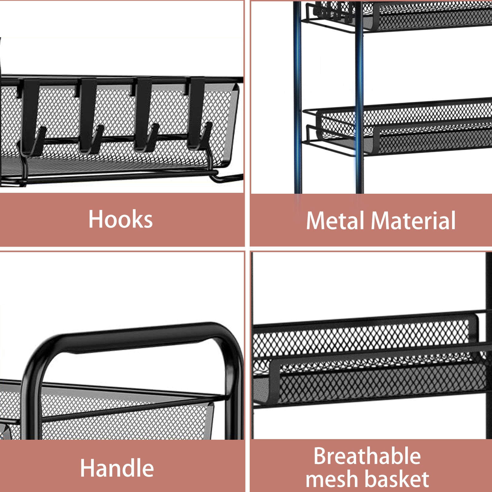 Mesh Rolling Cart with Lockable Wheels, 3 Tier Rustproof Metal Cart with Hooks, Kitchen Rolling Shelf, Mesh Storage Basket for Living Room, Bathroom, Kitchen, Office, Black