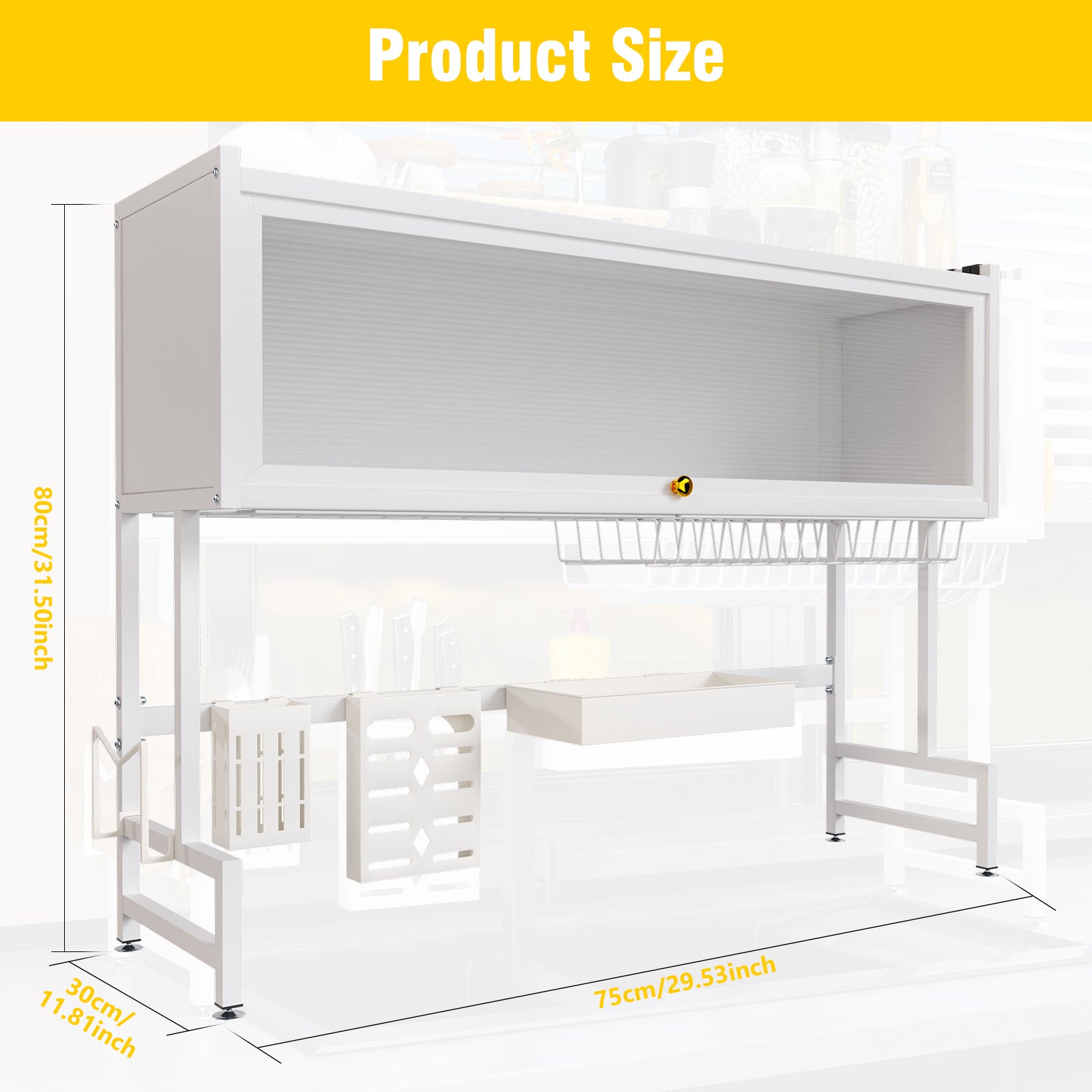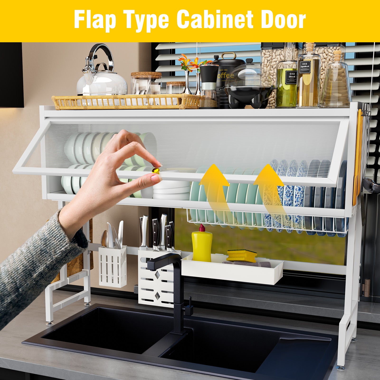 Over The Sink Dish Drying Rack, 2 Tier Metal Steel Dish Drying Racks for Kitchen Counter with Hooks Paper Towel Utensil Cup Holder Sink Caddy (White-29.34"L)