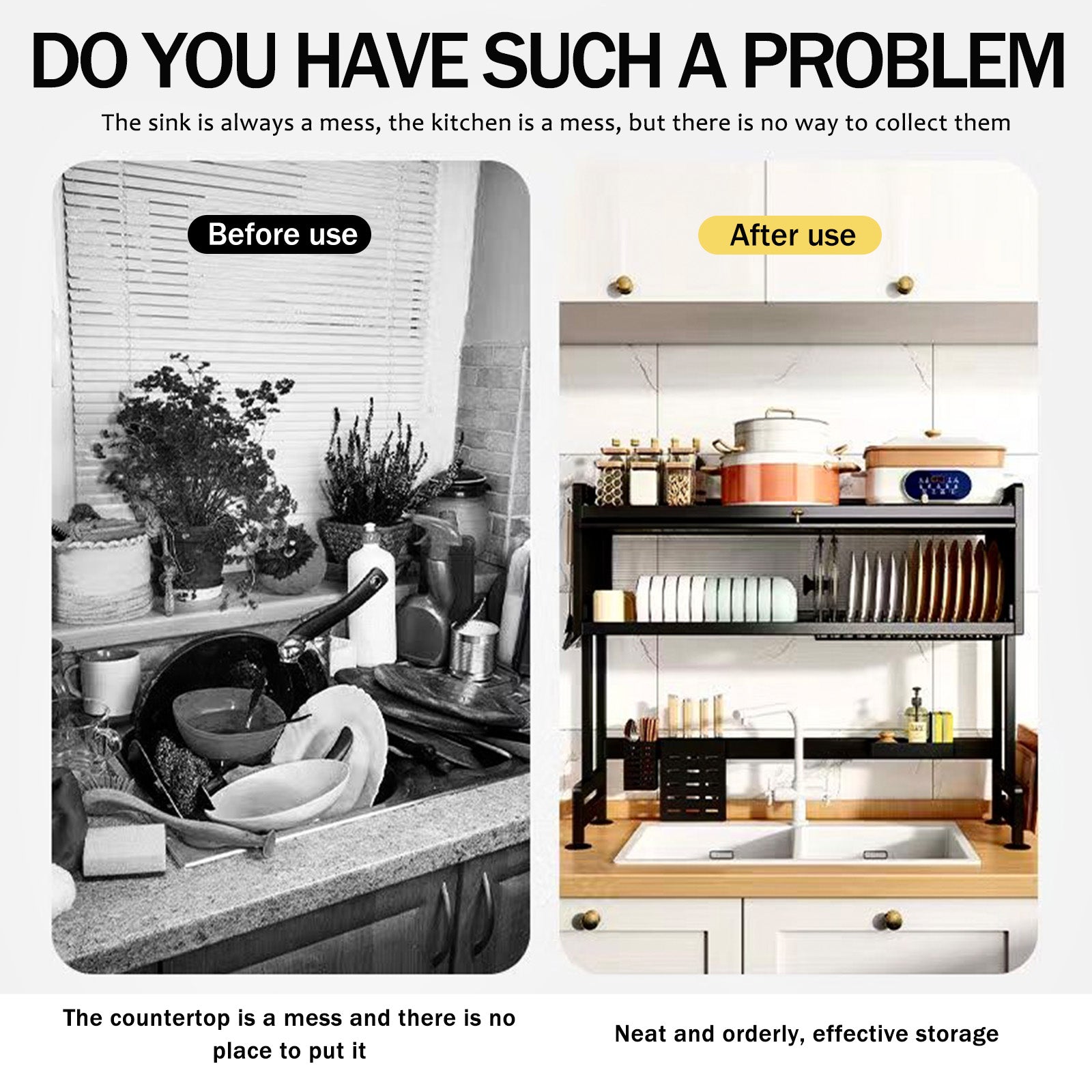Say goodbye to kitchen clutter and embrace a well-organized space! This sink storage rack features versatile slots, hooks, and spacious shelves to provide dedicated storage for dishes, cutting boards, and other kitchen essentials, making them easily accessible and simplifying your prep work. It acts like a space magician, effortlessly mounting on the wall or placing on the countertop, instantly freeing up valuable space and brightening up your kitchen. Thoughtful design elements include dedicated storage for knives, chopsticks, and drain trays, ensuring everything has its place, safely and conveniently. Easy to assemble without tools, you can quickly enjoy the benefits of a tidy kitchen and the enhanced quality of life it brings.