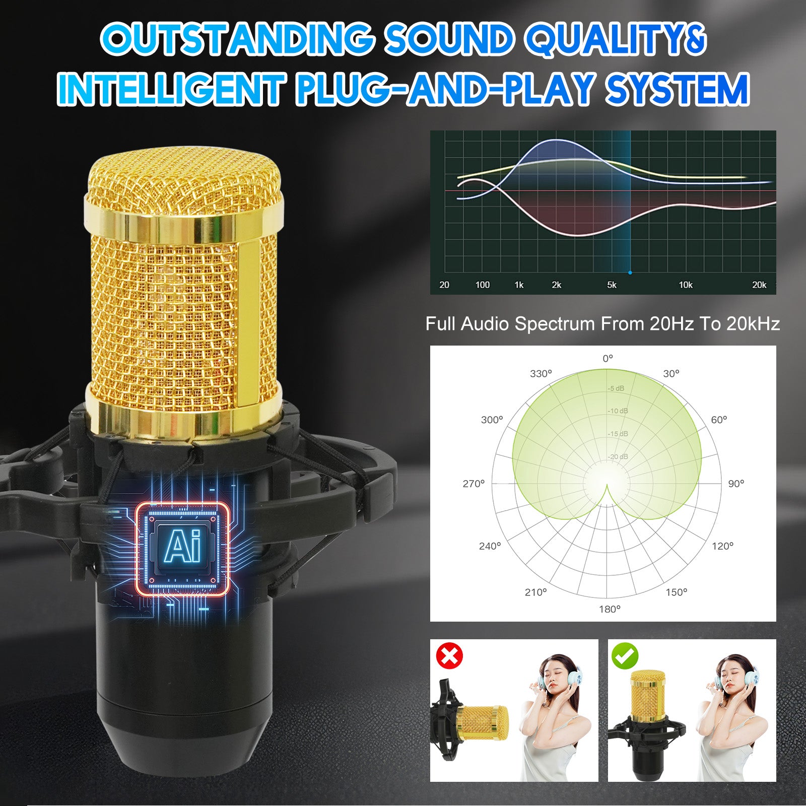 This all-in-one audio bundle is designed for content creators, featuring broadcast-grade condenser microphones and professional accessories to effortlessly meet podcasting, live streaming, and music recording needs. The metal-constructed microphones with high-sensitivity capsules deliver 20Hz-20kHz frequency response, while cardioid polar patterns effectively reduce ambient noise for studio-quality clarity.