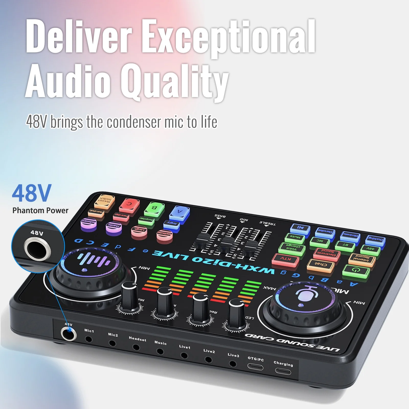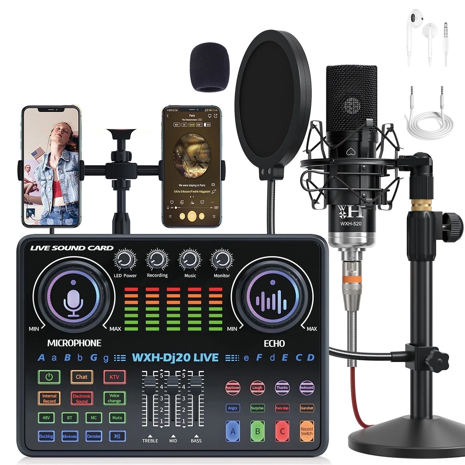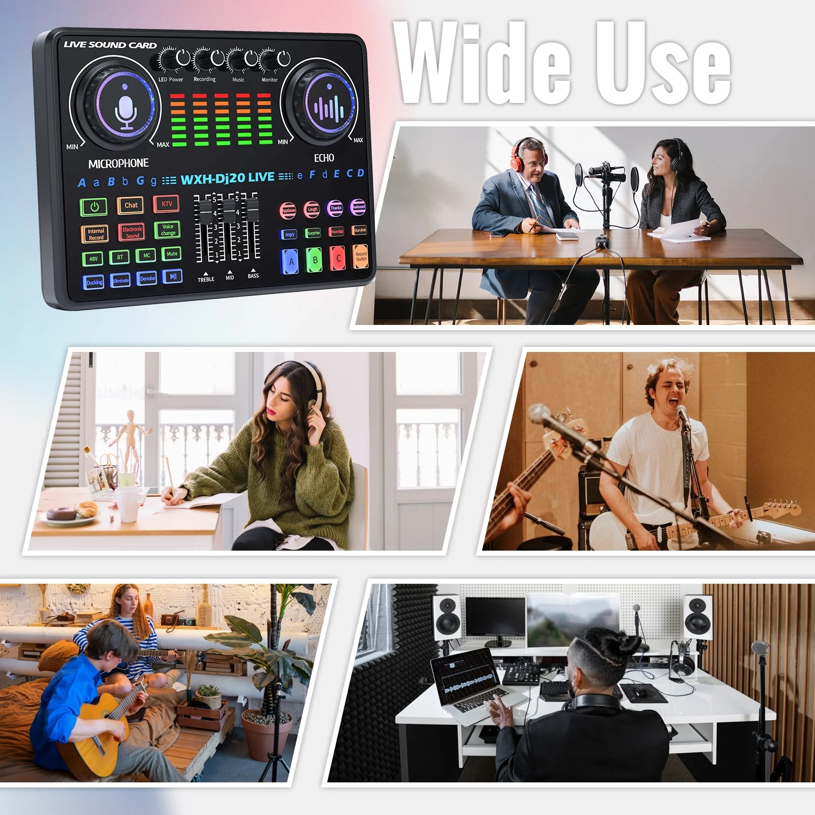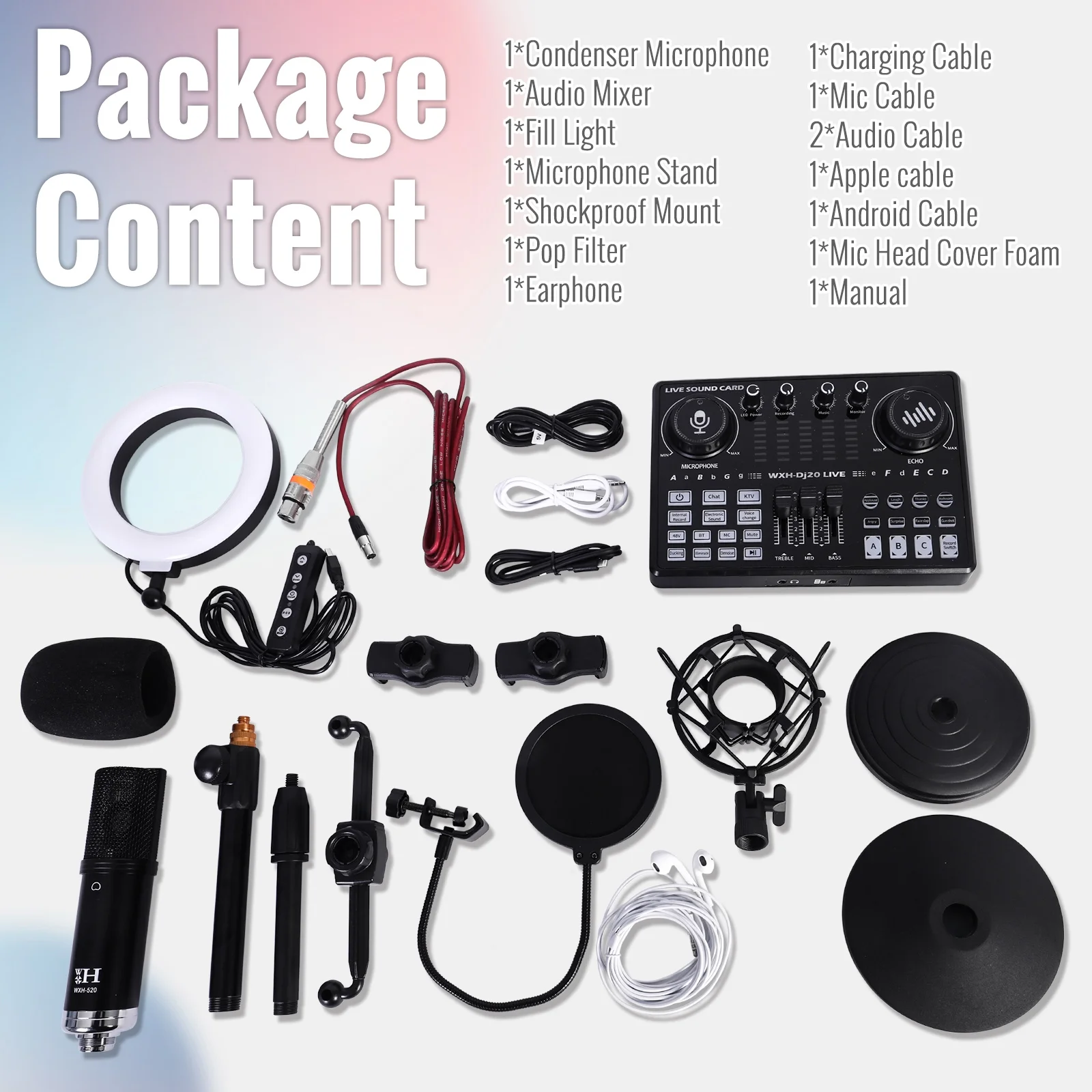 This microphone kit is an audio control device, specially developed for live broadcast, audio and video recording. It can be connected to three microphones as voice input, built-in 48V phantom power supply and audio interface, and can be connected to instruments such as guitar for live music accompaniment. It has rich reverberation adjustment and can easily obtain professional recording studio effect. At the same time, it supports XLR large diaphragm condenser microphone, and instantly creates live music accompaniment, making your creation more vivid. It is very suitable for vocals, musical instruments, podcasts, voiceovers, interviews and live recordings, and also suitable for various occasions. Choose our podcast music equipment set to start a new chapter in the music journey!