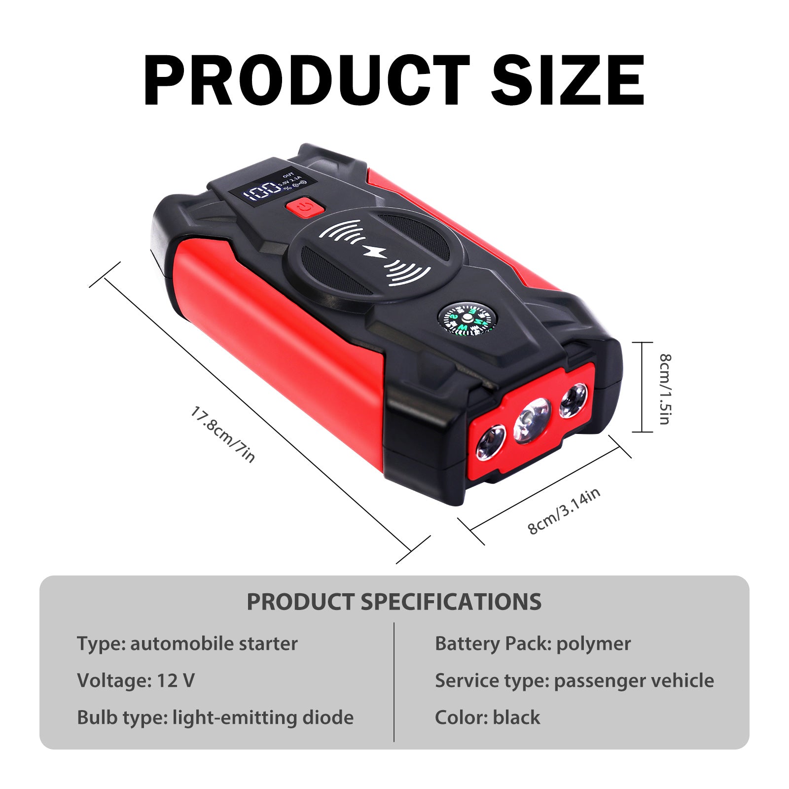 Our Deluxe Portable Car Starter is a powerful, exquisitely designed car jump starter that provides a convenient solution for your travel and emergencies. Whether it's starting a vehicle, charging a mobile phone, providing lighting, or even emergency rescue, this car starter power supply can meet your multiple needs. Its advanced technology and innovative design make it a powerful companion on the road, allowing you to enjoy the convenience and peace of mind brought by smart technology.