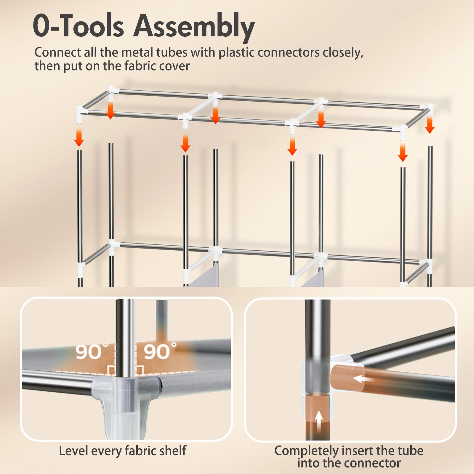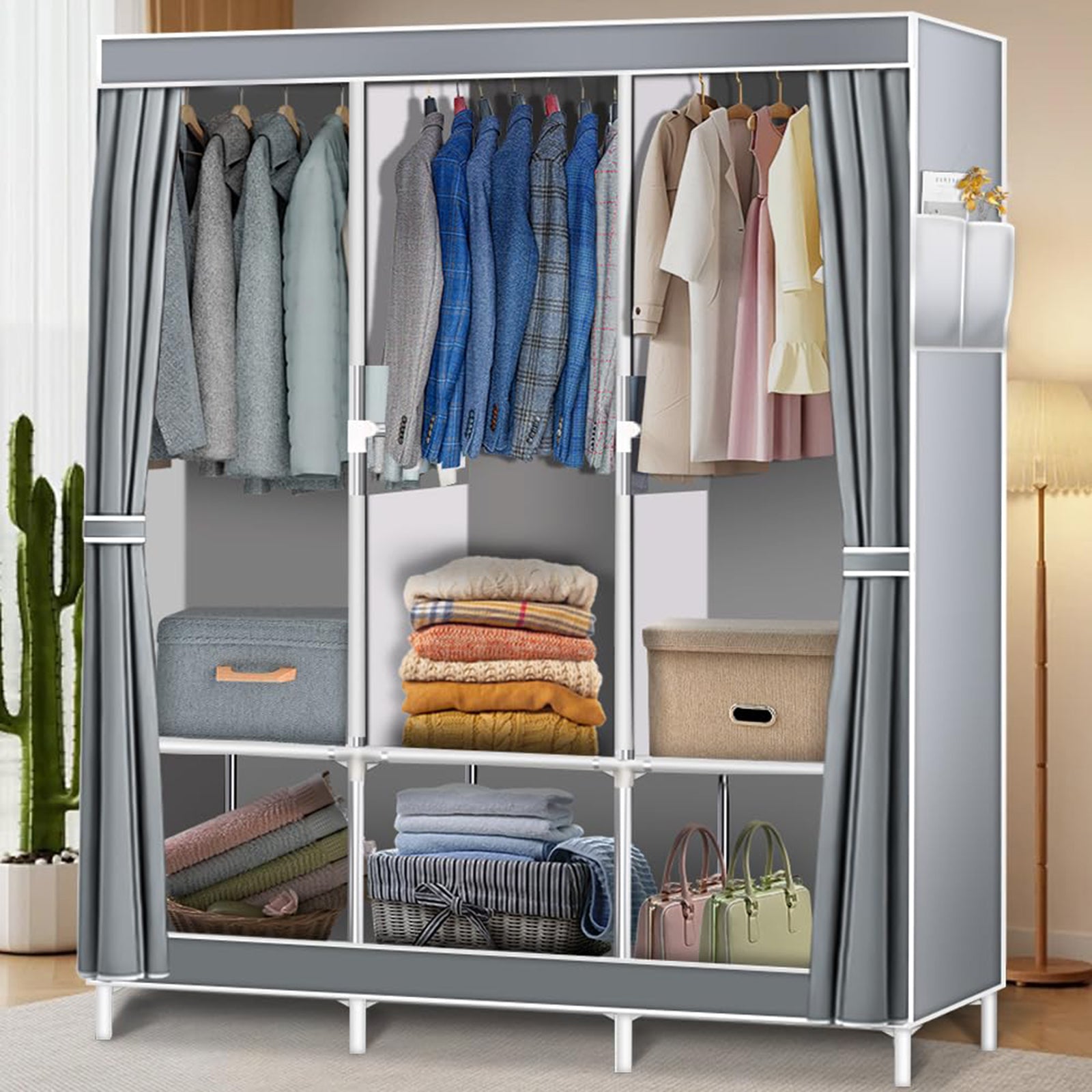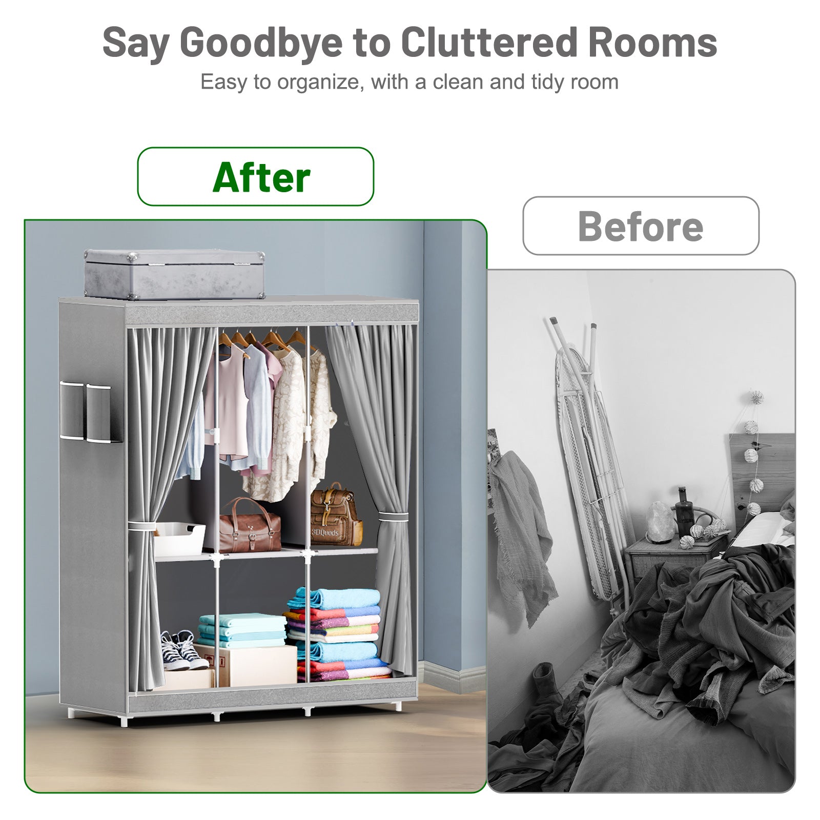 Portable Closet Organizer and Storage with 3 Hanging Rods for Hanging Clothes, 6 Wardrobe Closet Storage Shelves for Bedroom, Easy to Assemble, Grey