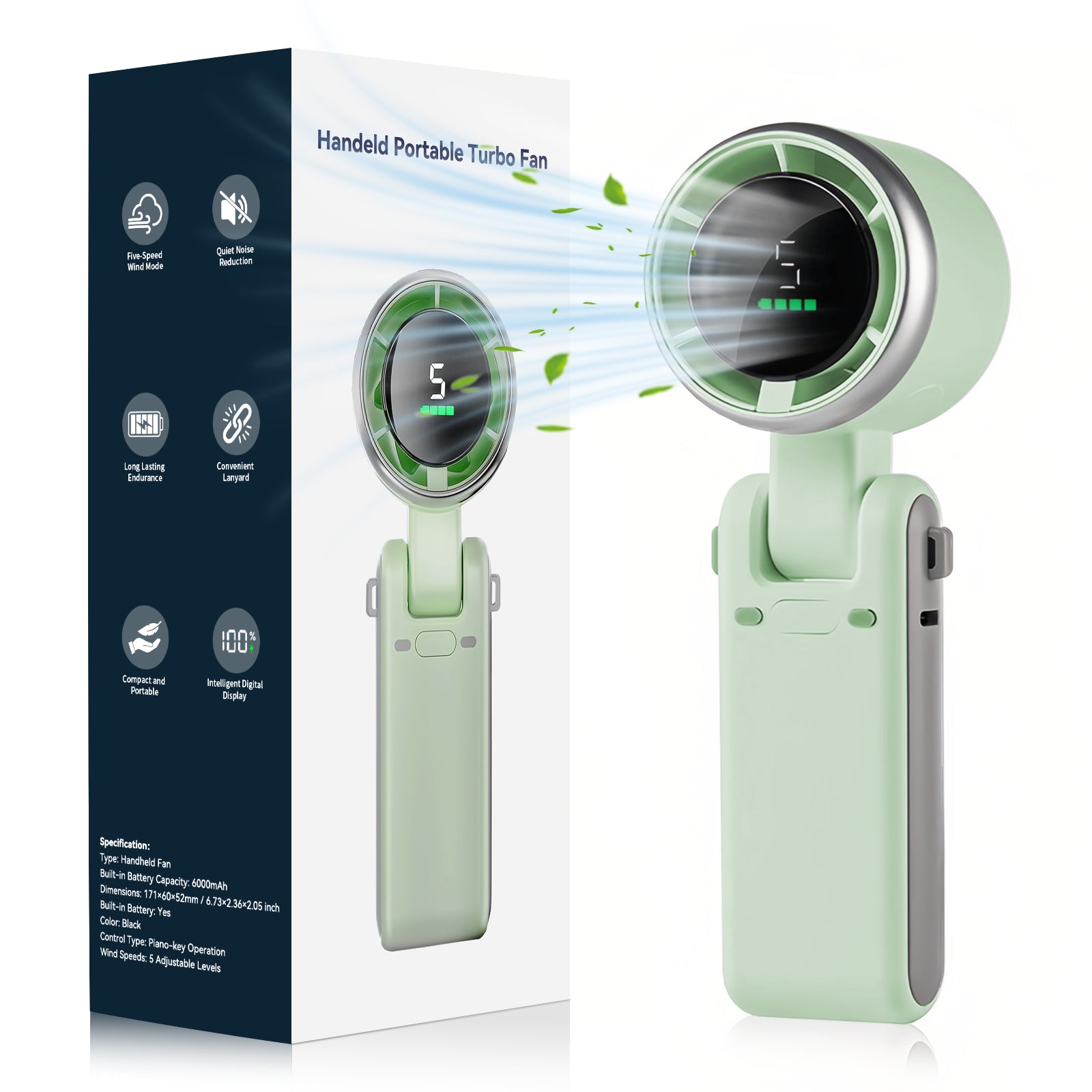 Portable Handheld Fan, 6000mAh 5-Speed USB Rechargeable Personal Fan,LED Digital Display 180¡ãFoldable Mini Desk Fan,Ultra Quiet Air Turbo Tech 3 IN 1 Hand Fan for Indoor Outdoor (Green)