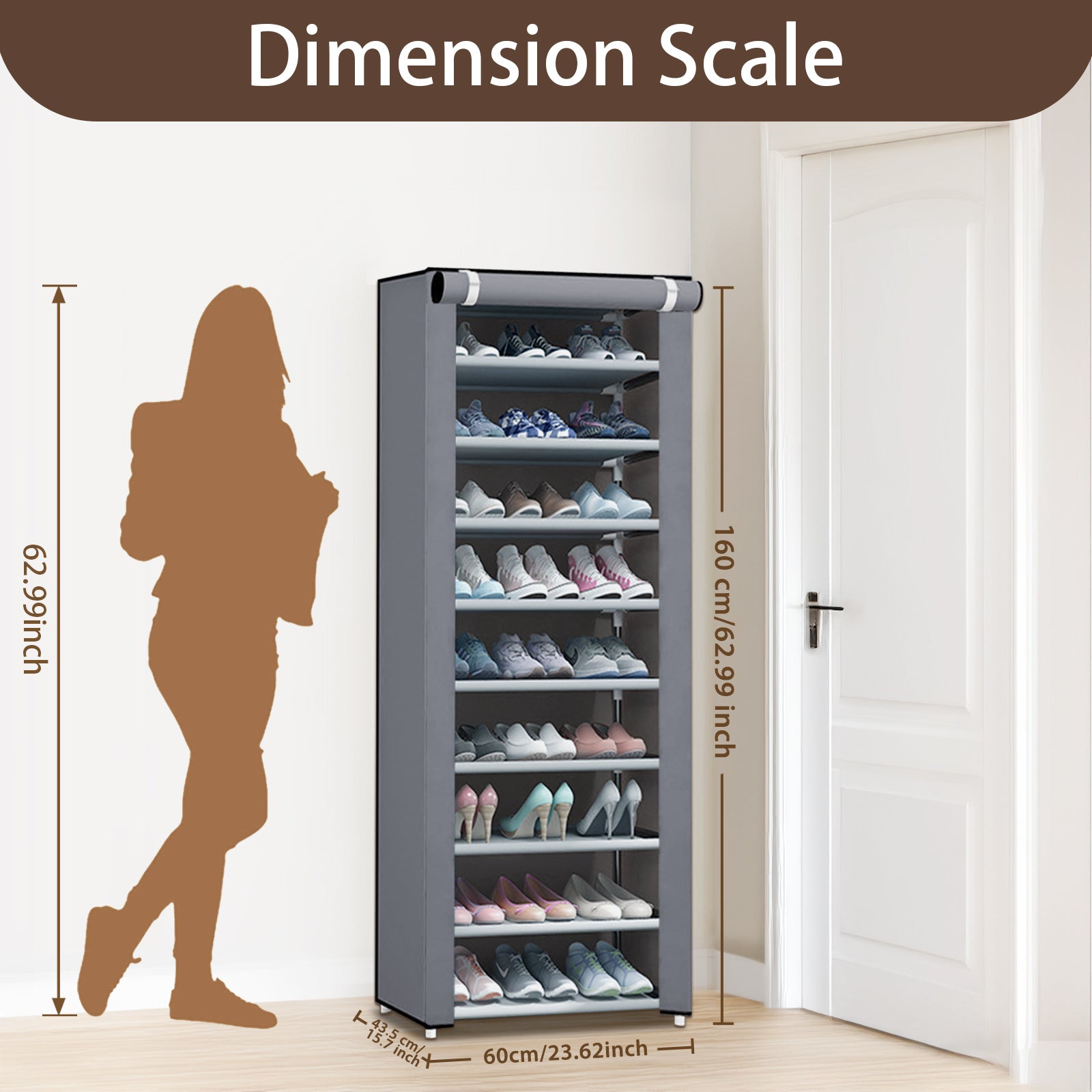 Portable Shoe Rack, 10-Tier 27 Paris Shoe Storage Cabinet with Cover, Non-Woven Fabric Shoe Storage Organizer, 9 Lattices Shoe Cabinet Tower Shelf Closet Silver Gray