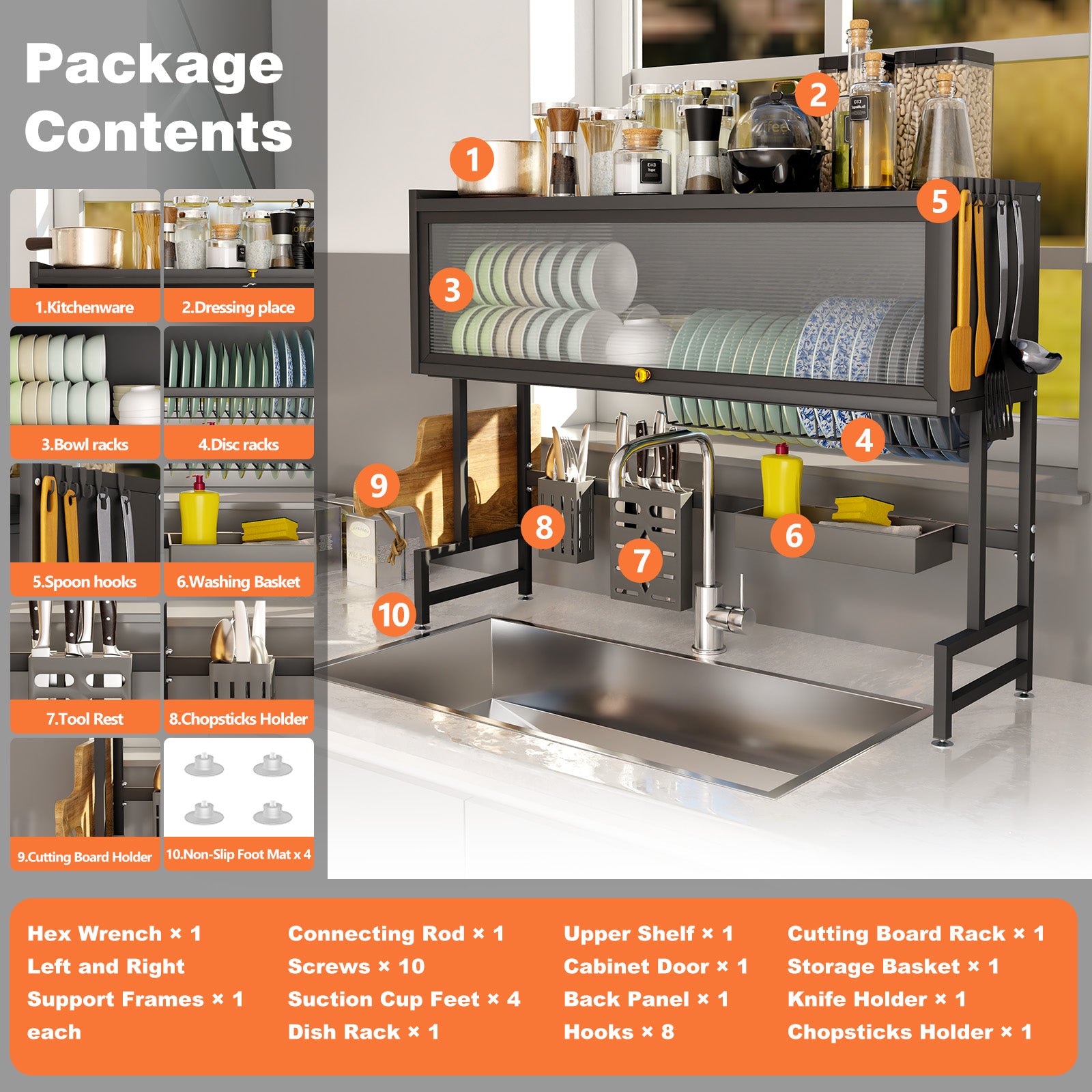 This sink storage rack features versatile slots, hooks, and spacious shelves to provide dedicated storage for dishes, cutting boards, and other kitchen essentials, making them easily accessible and simplifying your prep work.