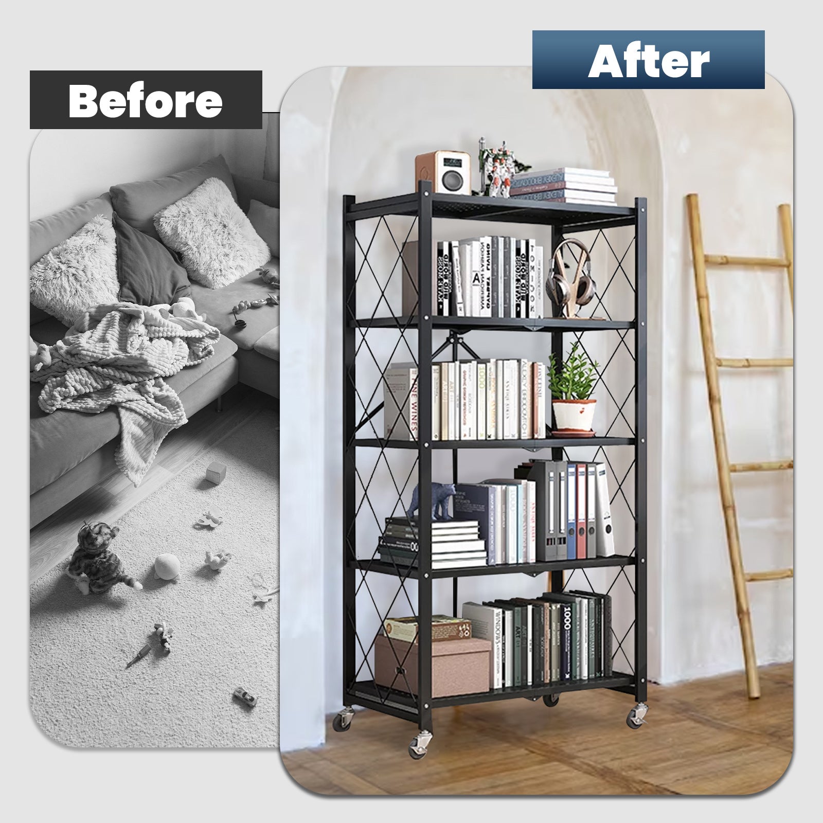 - When unfolded, it can provide you with more space for storage. And this storage shelf does not require tedious installation, only the wheels need to be installed, and the pre-assembled design allows you to have a better experience!