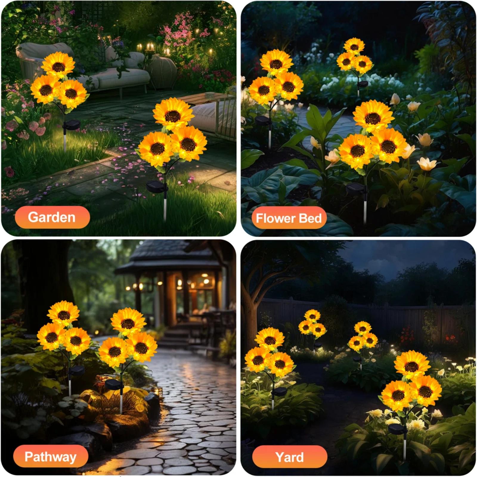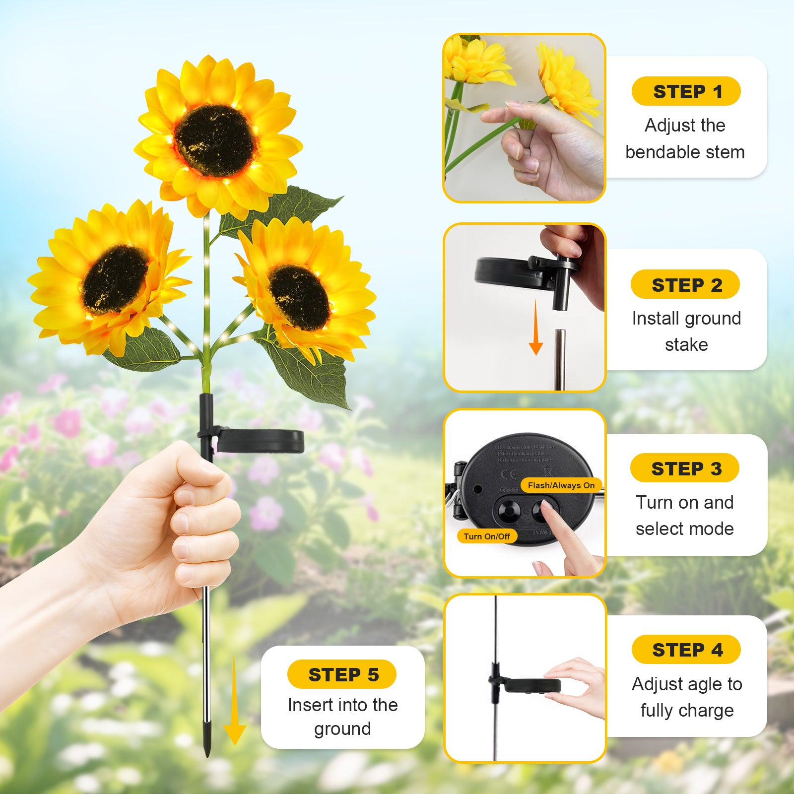 Our sunflower solar light outdoor has 3 bigger sunflower head with 36 LED string lights, brighter than other outdoor solar lights decorative. The upgraded design uses specialized iron wire and glowing bright steam. No wires and no additional tools required simply insert them into the soil, turn on the switch, and enjoy a beautiful nighttime view. Providing a special waterproof design, these lights shine through all weather conditions, rain or shine. The enlarged 7cm solar panel ensures ample sunlight absorption, providing long lasting illumination. Equipped with a switch control and multiple mode adjustments, they absorb sunlight during the day and automatically light up at night, personalizing your garden experience. High quality sunflower solar lights outdoor will make your garden more vivid.