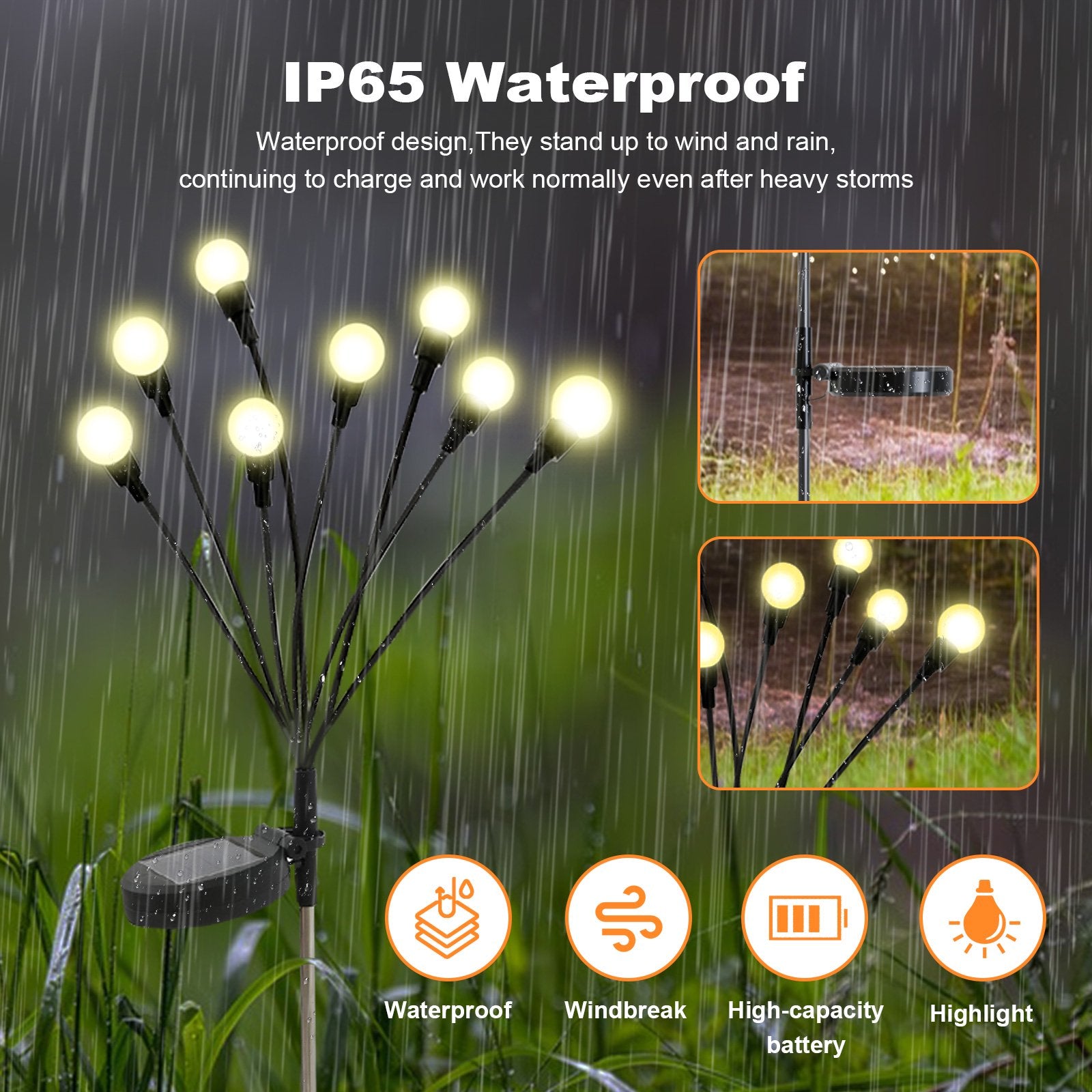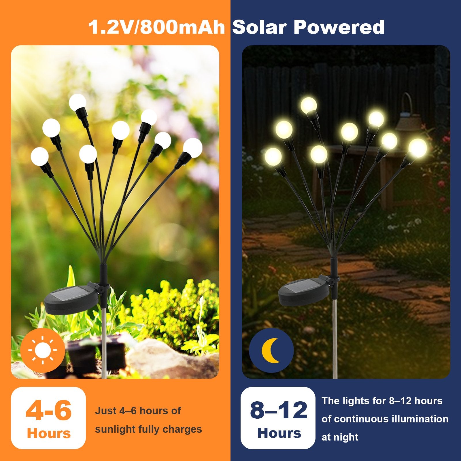 These lights feature a soft wire support that sways gently in the breeze, mimicking the enchanting flight of fireflies and adding a romantic atmosphere to your garden. The upgraded design uses specialized iron wire and a heavy-duty bulb base for a more natural and smooth swaying effect. No complicated installation is required, simply insert them into the soil, turn on the switch, and enjoy a beautiful nighttime view. With a special waterproof design, these lights shine through all weather conditions, rain or shine. The enlarged 7cm solar panel ensures ample sunlight absorption, providing long-lasting illumination. Equipped with a switch control and multiple mode adjustments, they absorb sunlight during the day and automatically light up at night, personalizing your garden experience. Enjoy the convenience and beauty brought by solar energy!