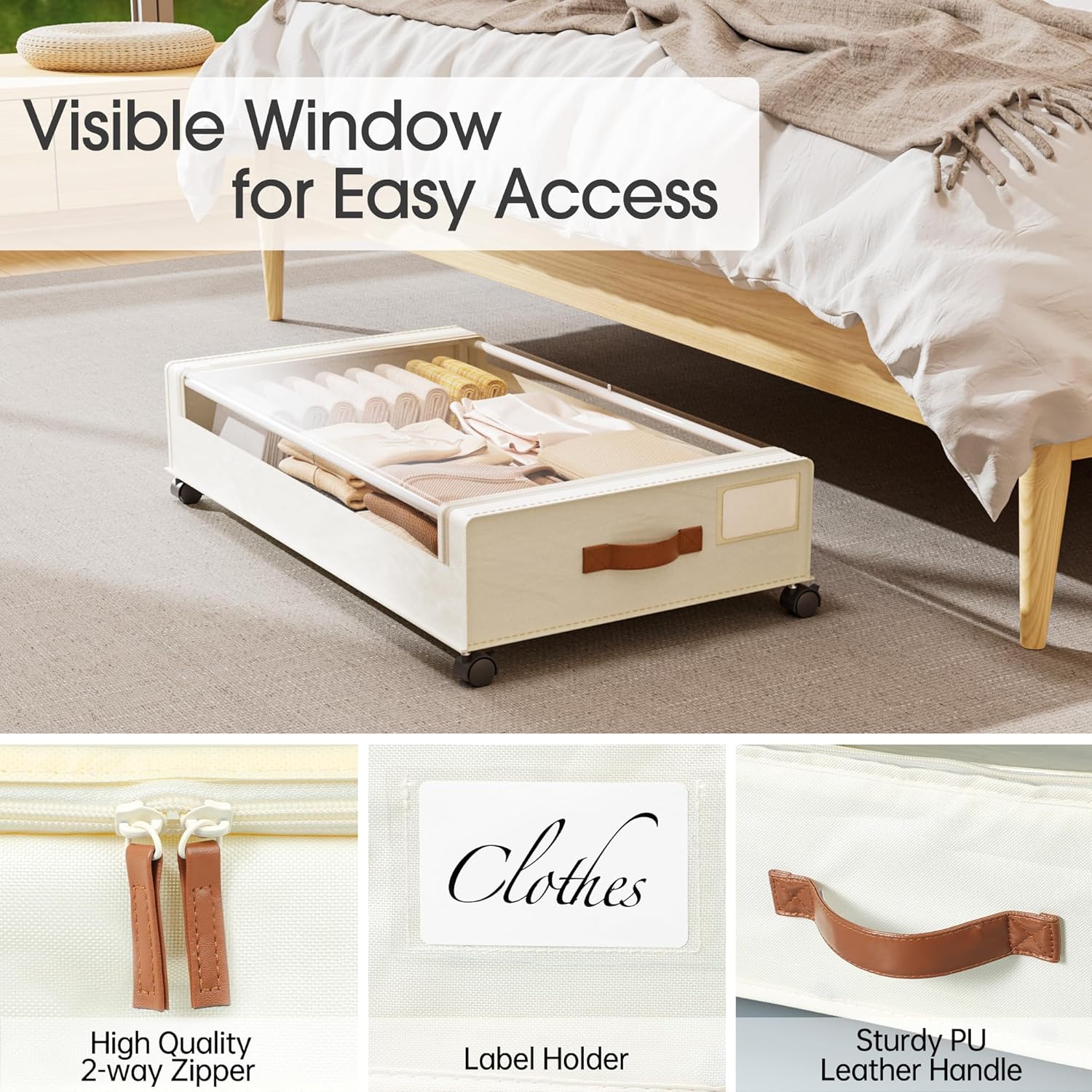 Under Bed Storage with Wheels, 2 Pack Under Bed Storage Containers, 60L Under Bed Shoe Storage with Clear Window & Label, Rolling Under Bed Metal Drawer for Clothes, Shoes,Toys, Books, Blankets